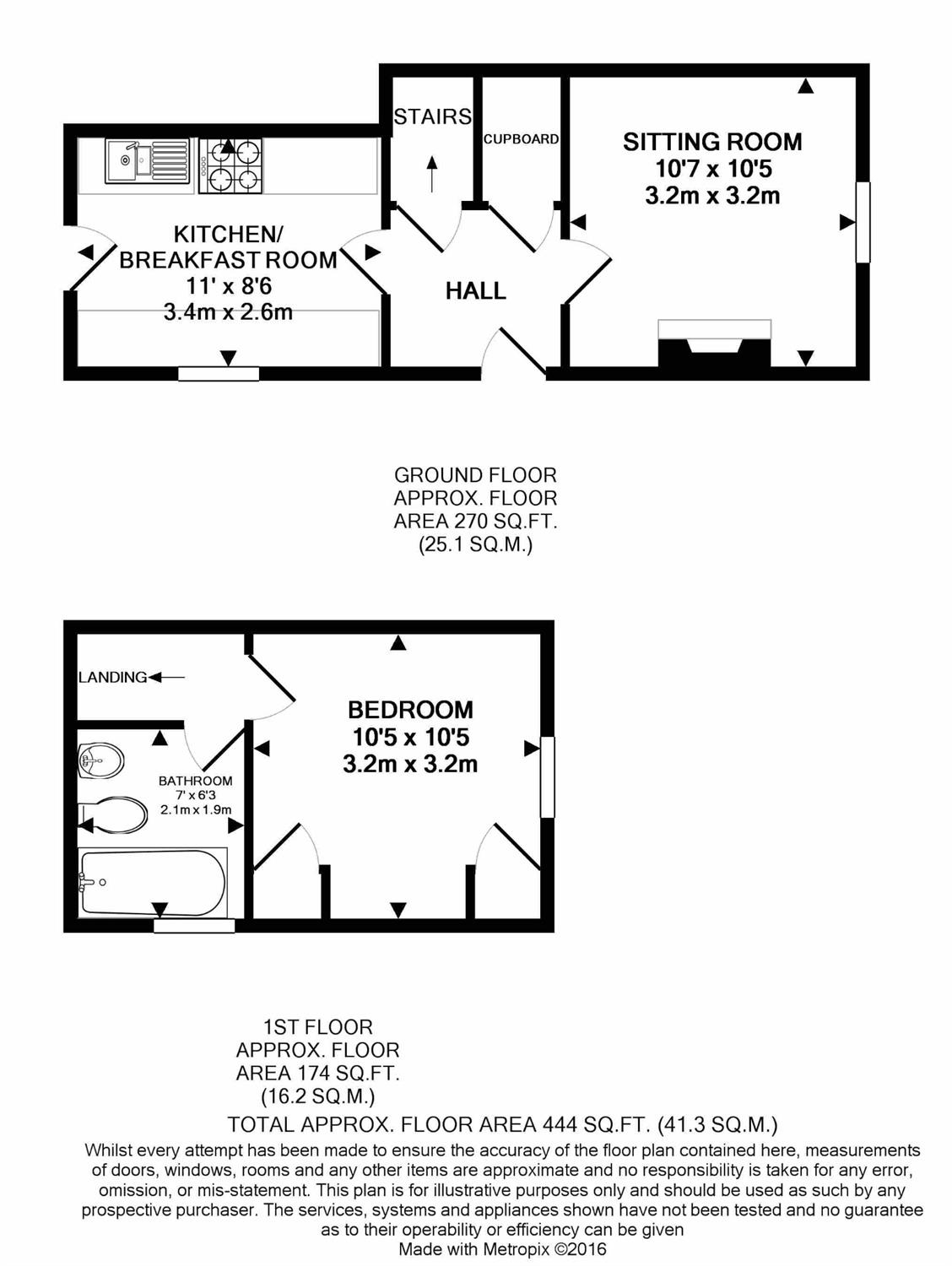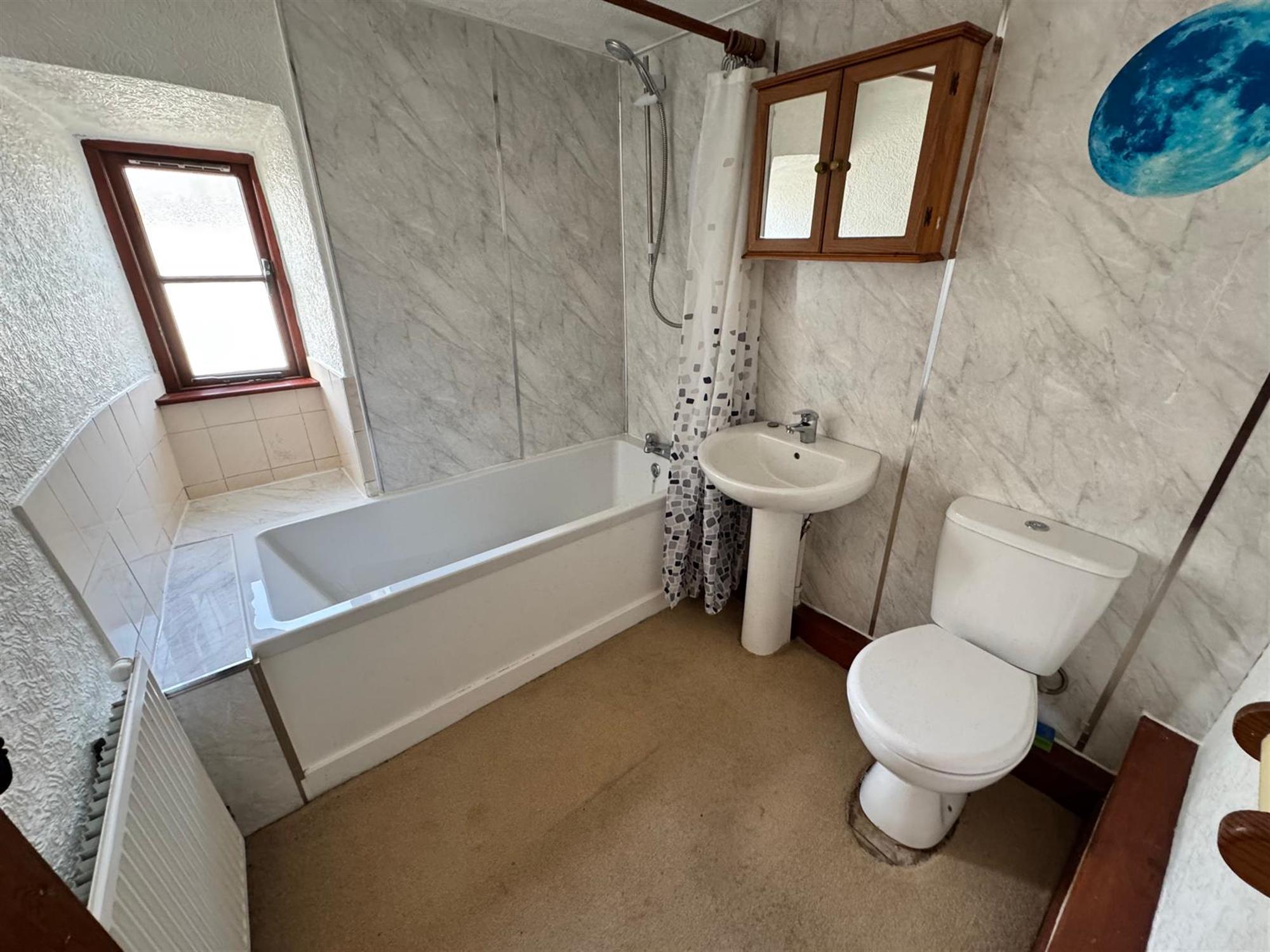 BATHROOM7' (2.13m) x 6'3 (1.9m) Opaque window to the side. Panelled bath in full tiled surround with electric shower. Pedestal wash hand basin in tiled splashback. Low level W.C. Radiator.