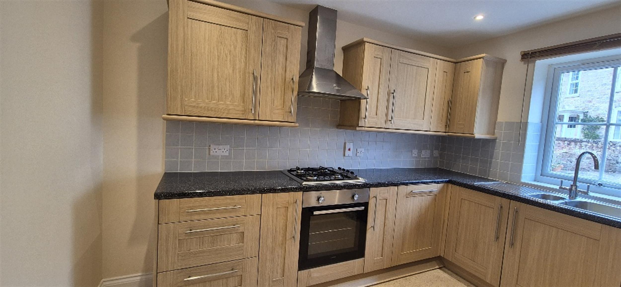 Modern fitted kitchen with stainless steel sink and drainer. Space for washing machine. Integrated dishwasher.