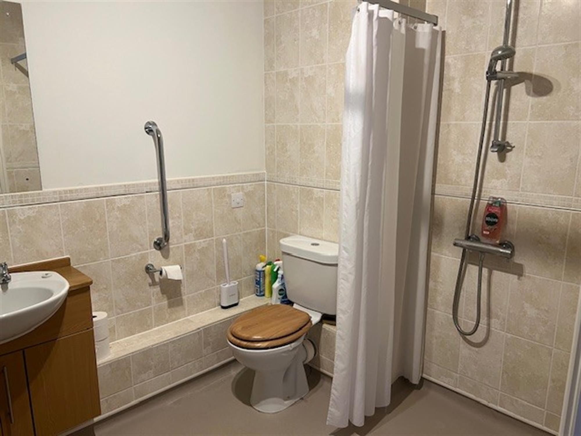* Wet room with level access shower and a bath