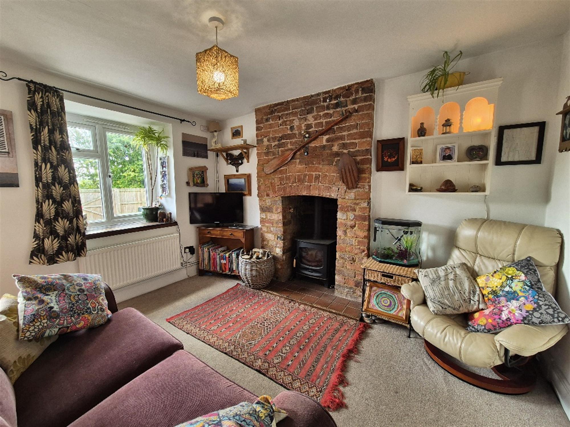 SITTING ROOM 11'8 (3.55m) x 11'9 (3.58m)A room of great character. Under stairs storage. uPVC double glazed window with timber sill. Radiator. Full height exposed brick chimney breast incorporating recessed wood burner on tiled hearth. Exposed timbered staircase rising. Stripped door to:-