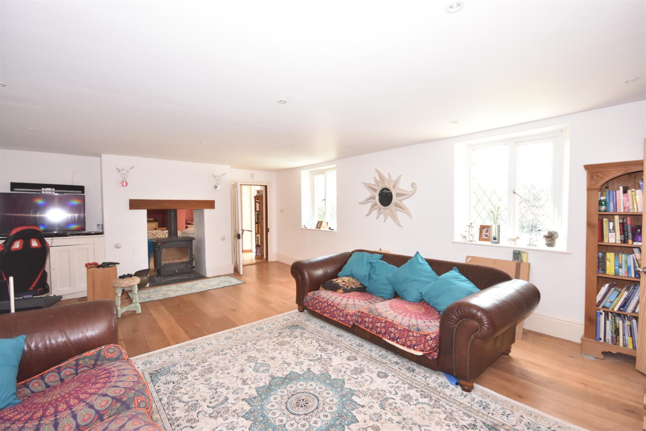 A large bright room. Two double glazed leaded windows overlooking the gardens. Oak flooring. Cast iron woodburner on a slate hearth. Fitted storage cupboards. Downlighters. Underfloor heating.