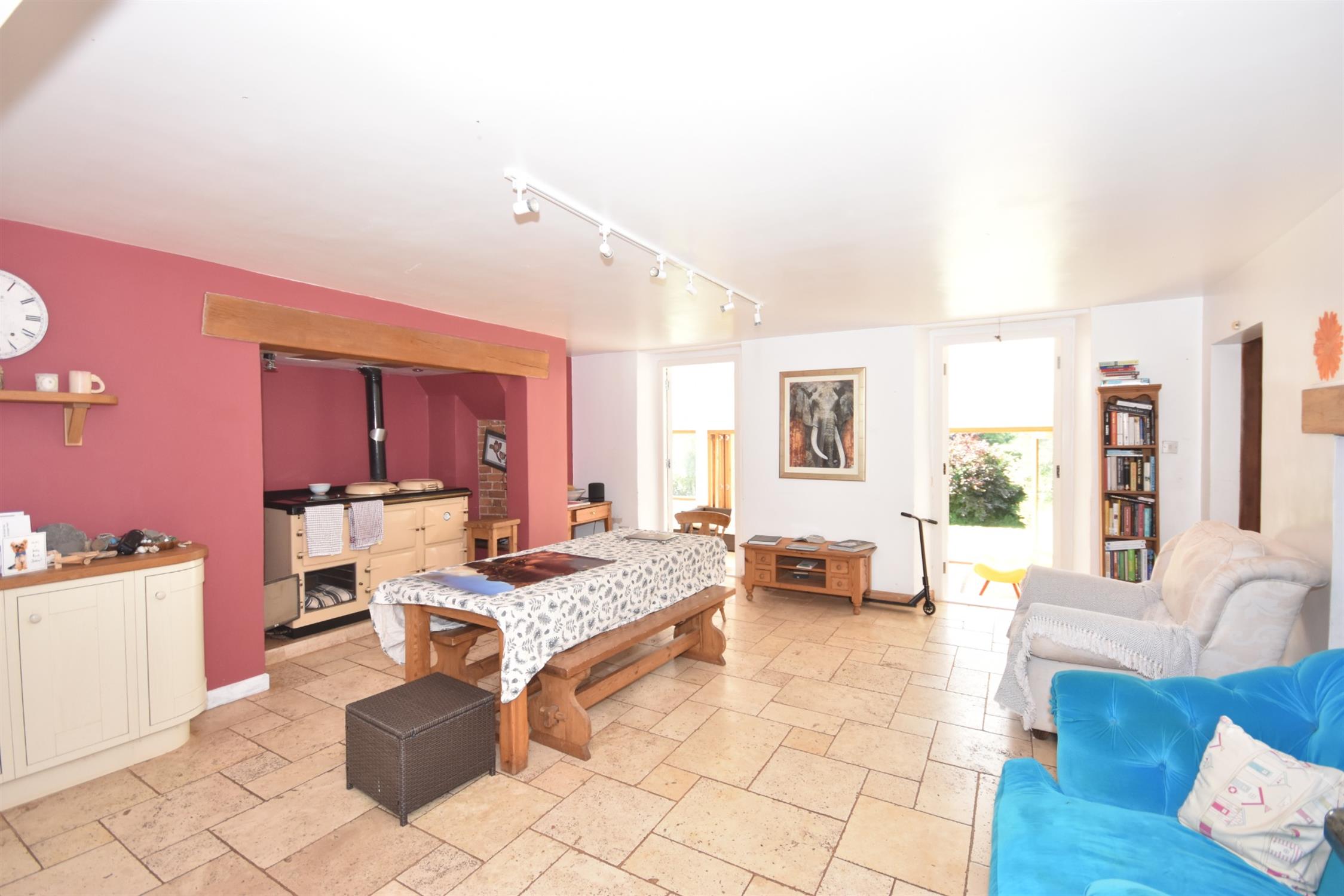 Stone tile flooring continuing from the kitchen. Large Inglenook style recess with electric five oven Aga with twin hotplates and back-up Neff ceramic hob. Iron door with a brick surround concealing a bread oven. Downlighters. Extractor fans. Door to the sitting room. Double sided cast iron woodburner providing heat into the dining room and into the sitting room. Underfloor heating. Two sets of double doors leading through to:-
