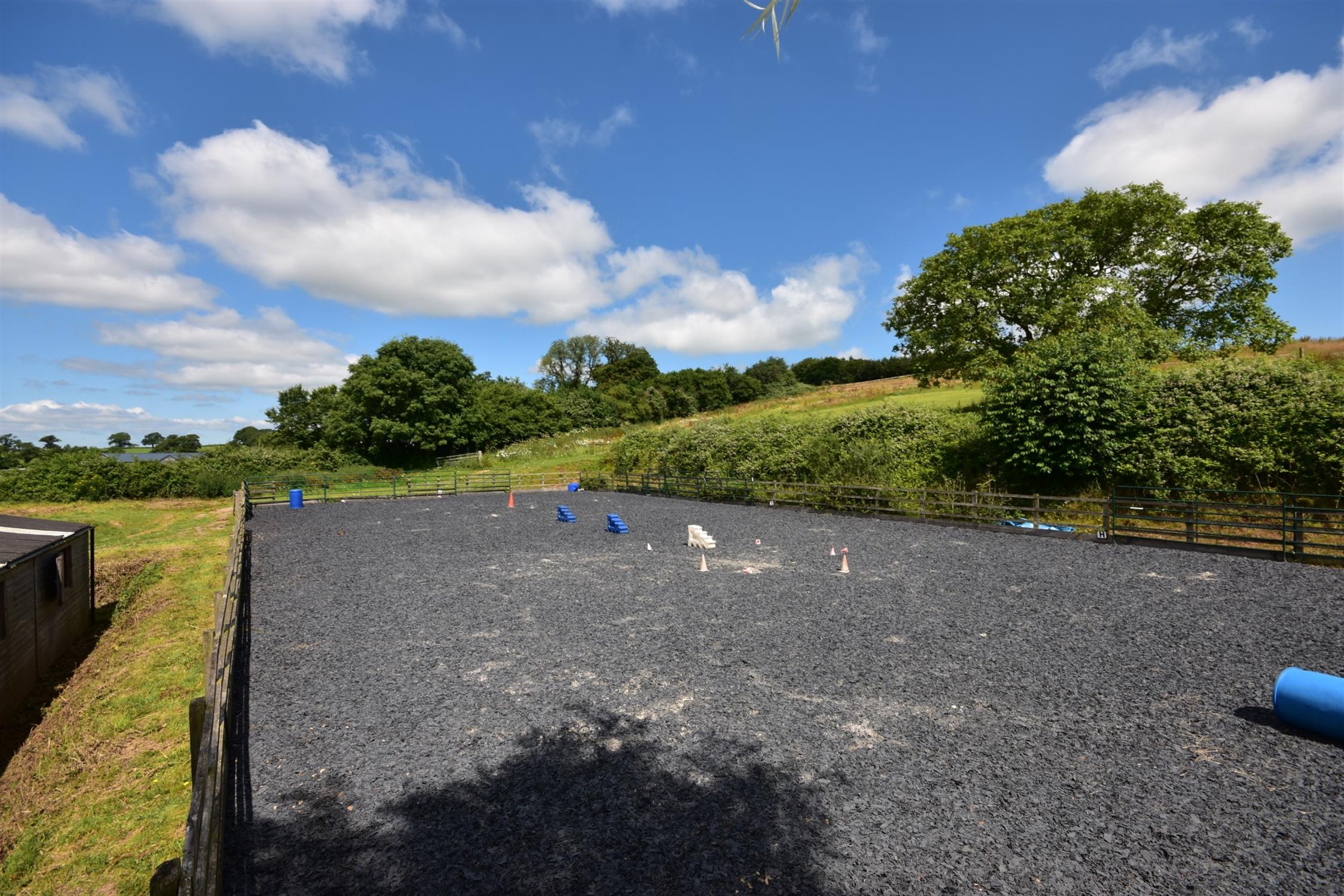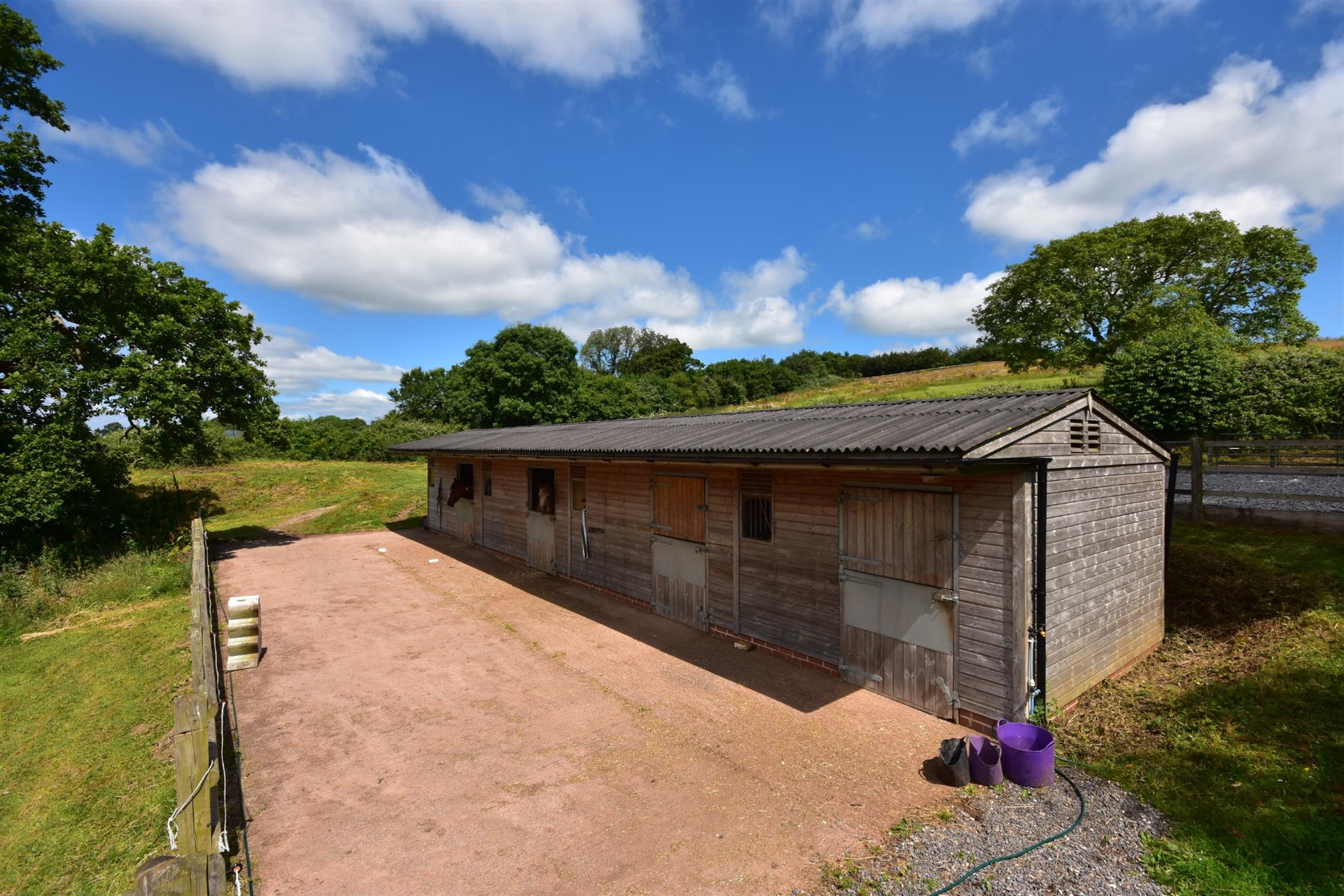 Southill Barton has an extensive gravel courtyard to the East and North of the house. A concrete drive leads from this to the rear entrance with double timber stud gates. There is a range of three general purpose mainly brick built store buildings. The stables are to the North of the house above a raised grass area and comprise loose boxes and a foaling box of timber construction below a corrugated roof. Behind this is a riding school with a "Springride" surface and arena measuring 65' 7" (20m) x 131' 3" (40m). Behind this are also two paddocks. The stables have a track leading back to the road.