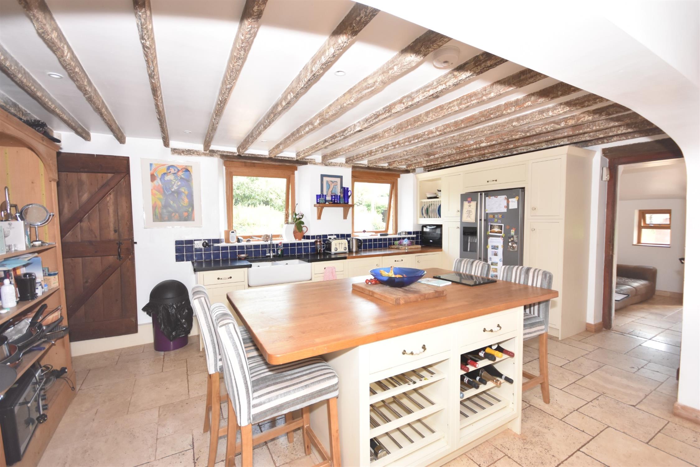 Heritage range kitchen with a central oak topped island unit with storage under. Further oak worktop surface with cupboards and drawers under. Built-in dishwasher. Twin white Belfast sink in a slate top with grooved drainer and mixer tap. Further storage. Space for American style fridge freezer. Two double glazed windows. Beamed ceiling. Underfloor heating. Door with stairs leading up to the first floor. Arched opening through to:-
