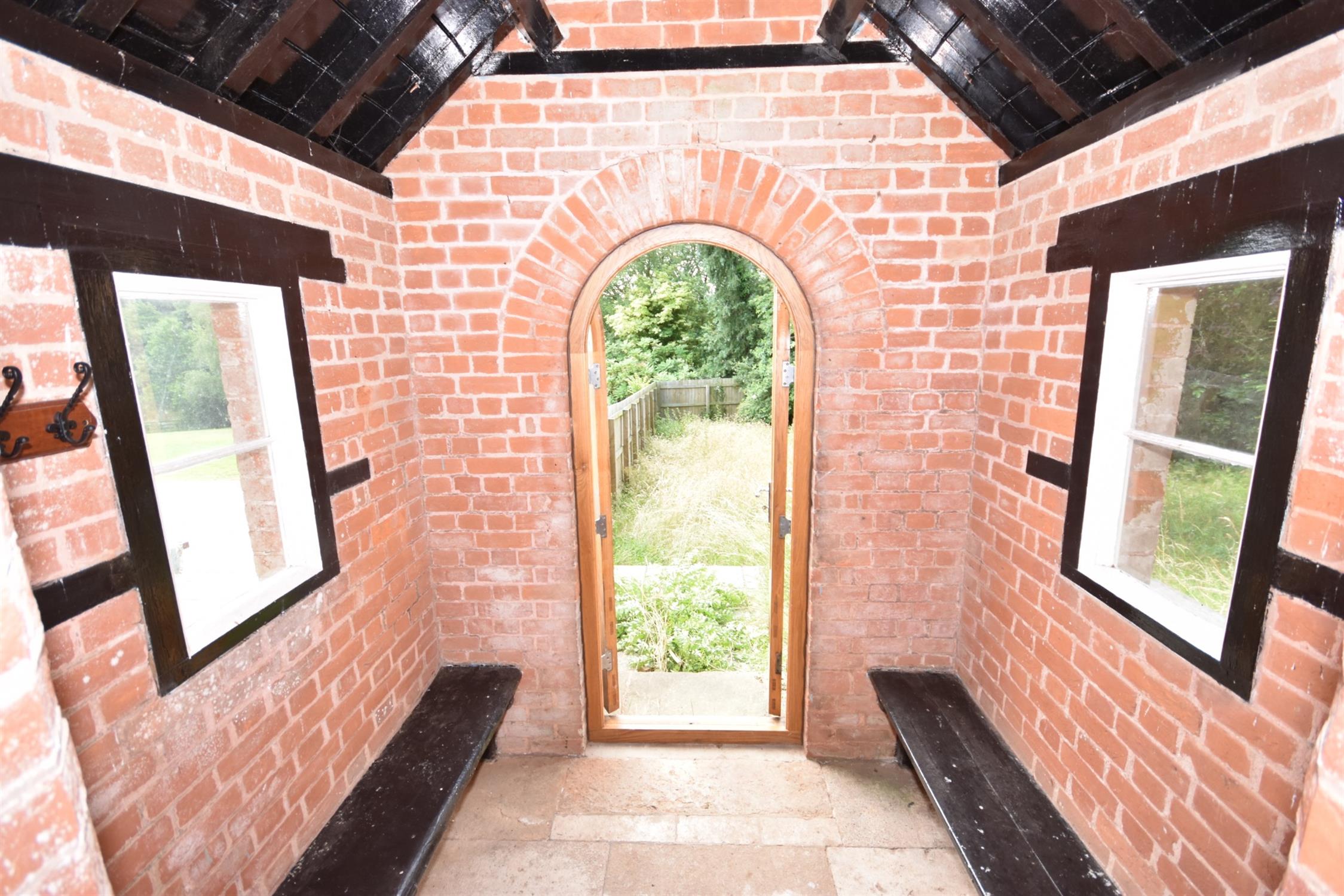 Stone flooring. Two windows to either side. Door leading to:-