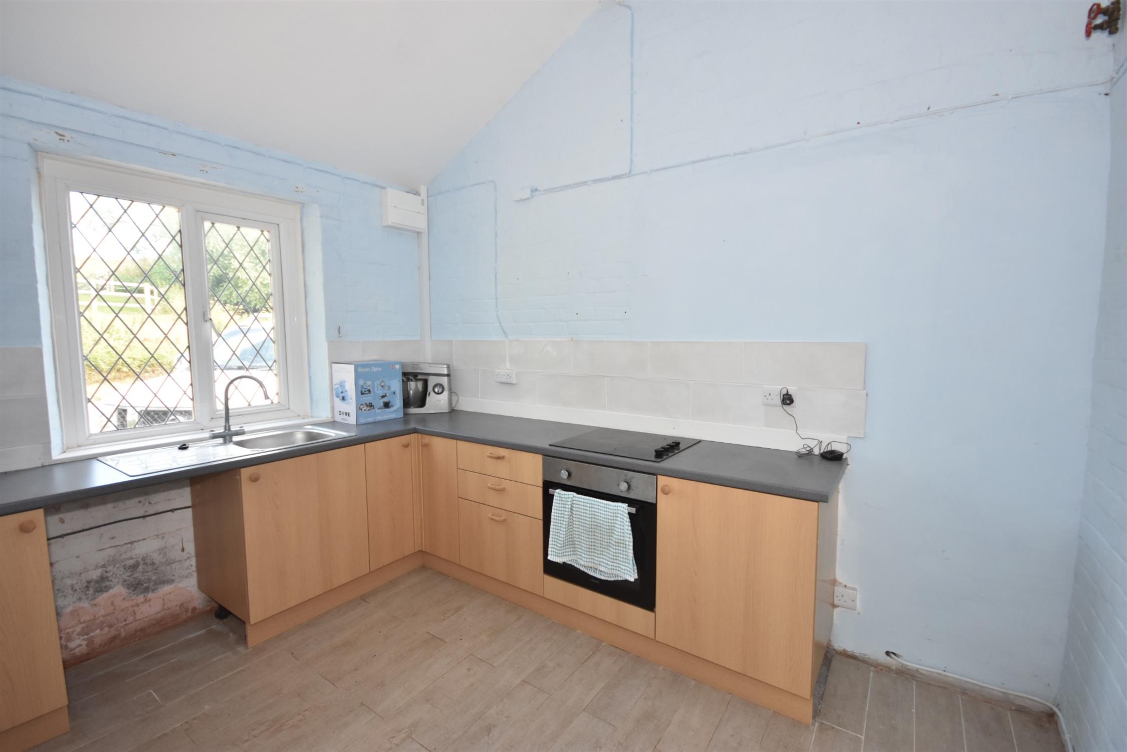 Roll edge worktop surfaces in tiled splashback. Stainless steel sink with drainer and mixer tap. Ceramic hob. Built-in oven. Cupboards and drawers under. Opaque double glazed window.