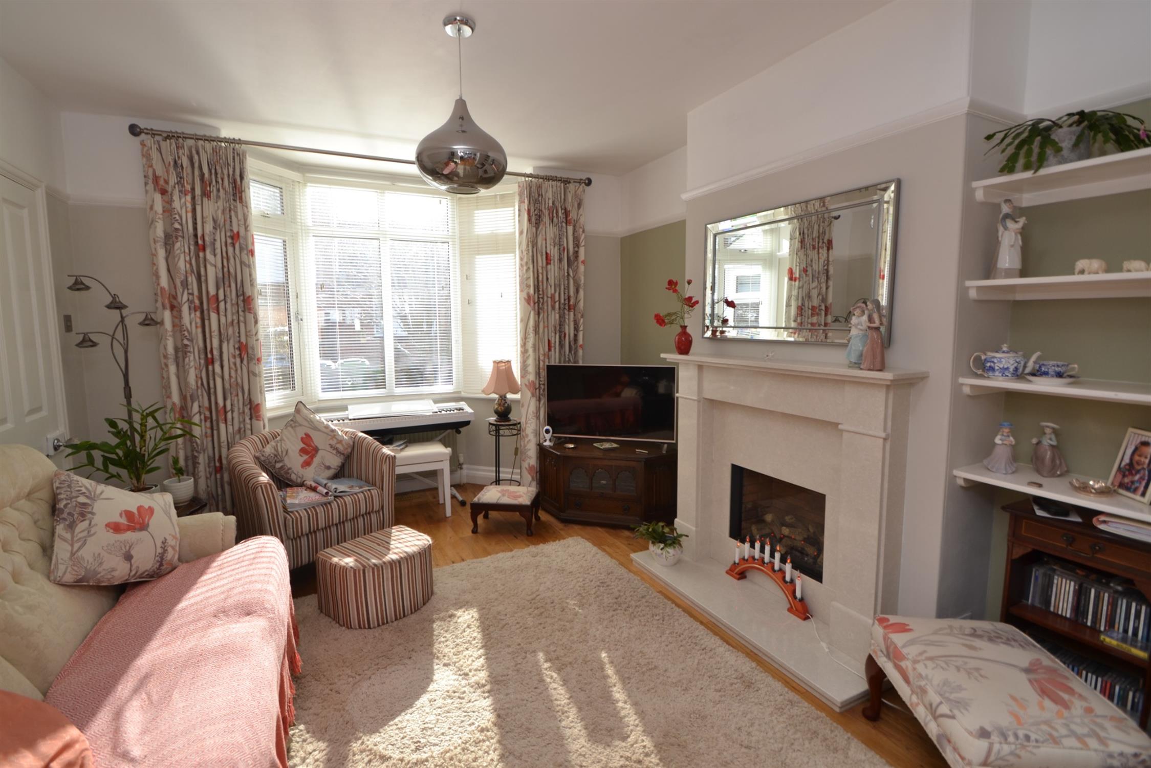 A most attractive room with three sided uPVC double glazed bay window with fitted blinds and having outlook to front. Radiator. Deep shelves in recess. Picture rail. Separate door to hall. Bespoke classic style pale marble fireplace incorporating Living Flame gas fire. Wide opening to:-