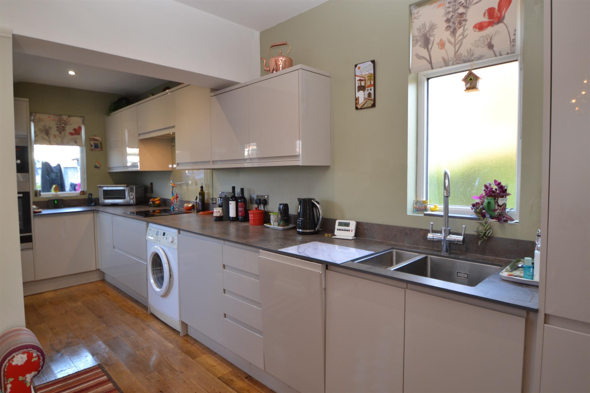 A high quality contemporary style kitchen having good range of units with high gloss facings in "Cashmere" and deep work surfaces. Inset stainless steel sink unit with swan neck tap. Lamona ceramic hob. Integrated dishwasher, freezer and fridge, fitted washing machine. Tall unit housing Lamona oven and separate combination microwave/oven, having drawer under and cupboard over. Further tall unit housing Vaillant combi boiler with dryer under. Range of wall units incorporating cooker hood and pelmet lighting. Radiator. Feature lighting. Triple aspect uPVC double glazed windows with matching door opening to the rear garden.