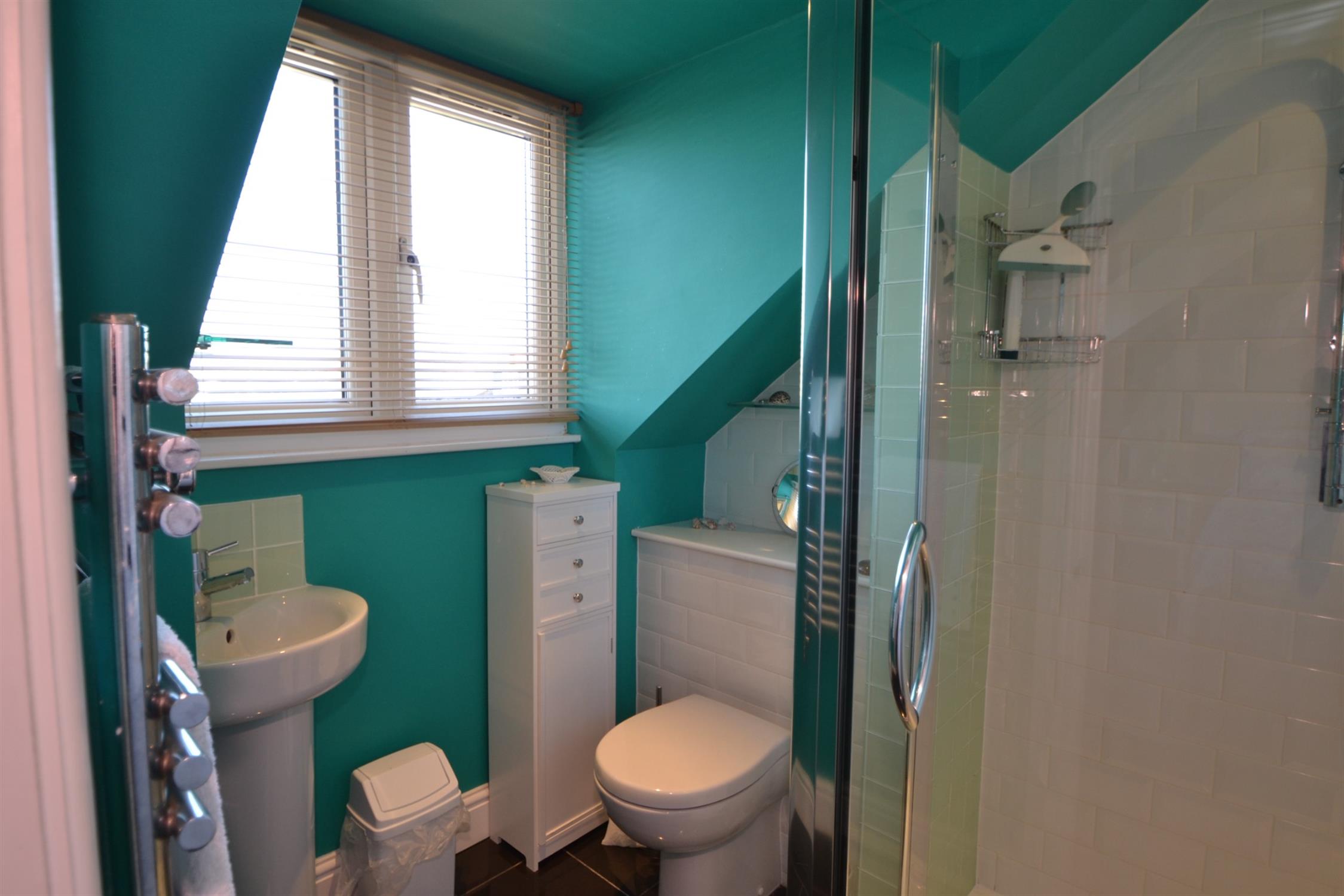 Very well appointed. Tiled shower with Tristan shower unit. Corner wash basin in tiled surround. Low level W.C. with concealed cistern. Deep shelf and glass shelf over. Tiled floor. Combination towel rail/radiator. Extractor fan. uPVC double glazed Dormer window with outlook to rear.