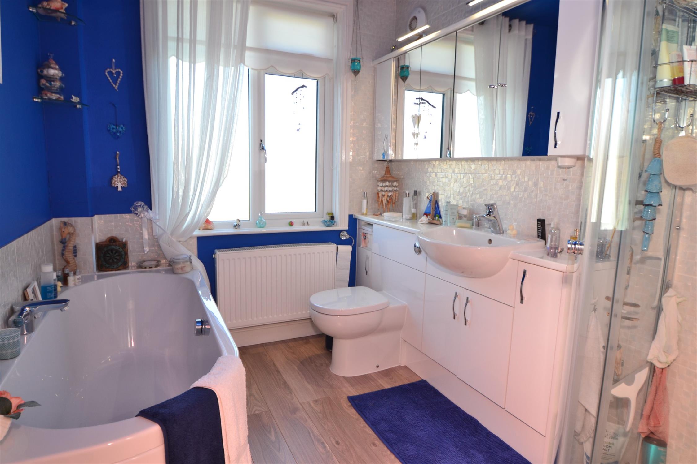 Very well appointed with quality suite in white comprising:- double ended bath with central mixer tap. Good size shower with Ideal shower unit. Wash basin with pillar tap semi recessed into extended vanity surface having cupboards and W.C. with concealed cistern under. Overlit part mirror fronted medicine cabinet/wall unit. Contemporary style towel rail/radiator. Extractor fan. Attractive wall tiling. Attractive flooring.
