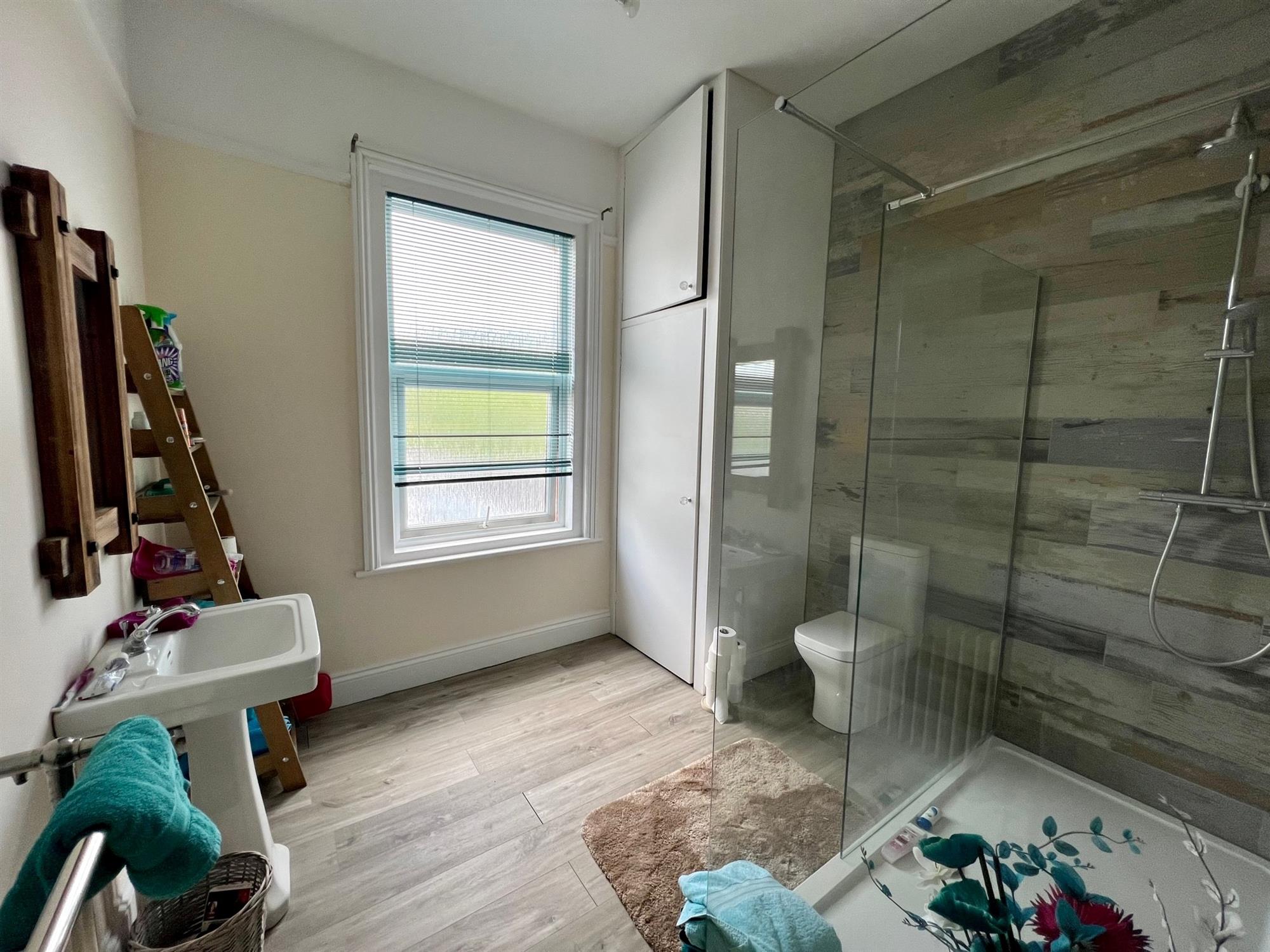 BATHROOM: Modern white suite comprising panelled bath with central mixer tap, pedestal wash hand basin with glass splashback and mixer tap, low level WC, large shower cubicle with sliding glass door and built-in shower, downlighters, extractor fan, double glazed Velux window, radiator.