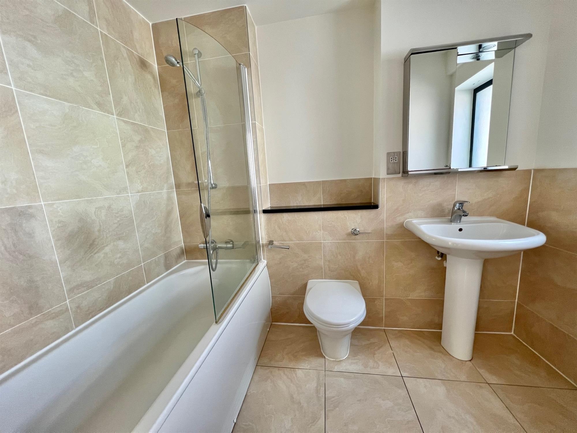 BATHROOM 8' 2" (2.49m) x 6' 5" (1.96m)Modern white suite comprising:- low level W.C. Pedestal wash hand basin. Bath in tiled surround with mixer shower over and glass shower door. Chrome runged radiator. Recessed halogen spotlighting. Extractor fan. Shaver socket. Fitted bathroom cabinet. Opaque glazed window.
