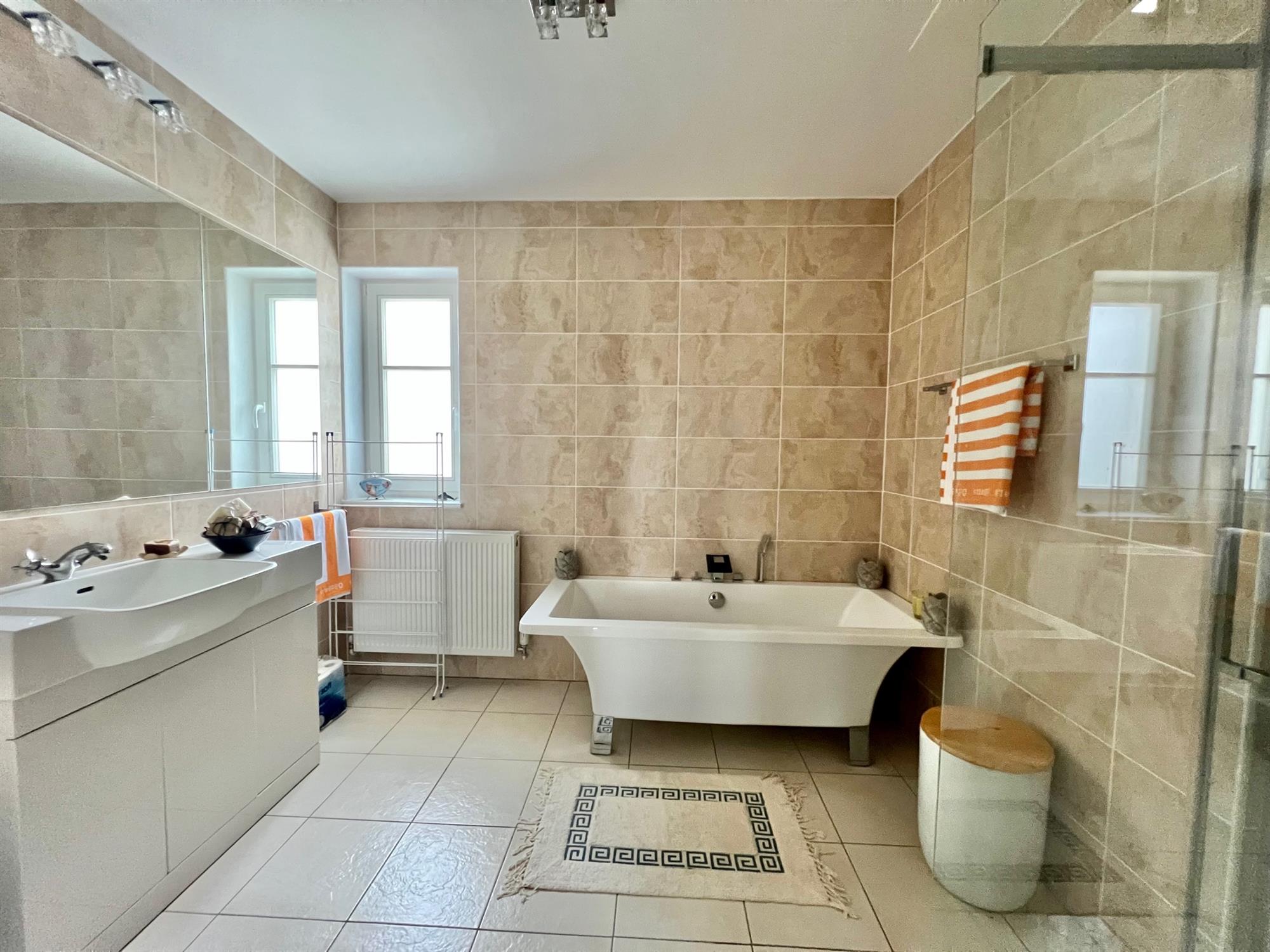 FAMILY BATHROOM 11' 2" (3.40m) x 7' 7" (2.31m)White suite comprising:- free standing bath. Large walk-in shower. Low level W.C. Wash hand basin with cupboard under. Tiled floor. Fully tiled walls. Opaque glazed window to the rear.
