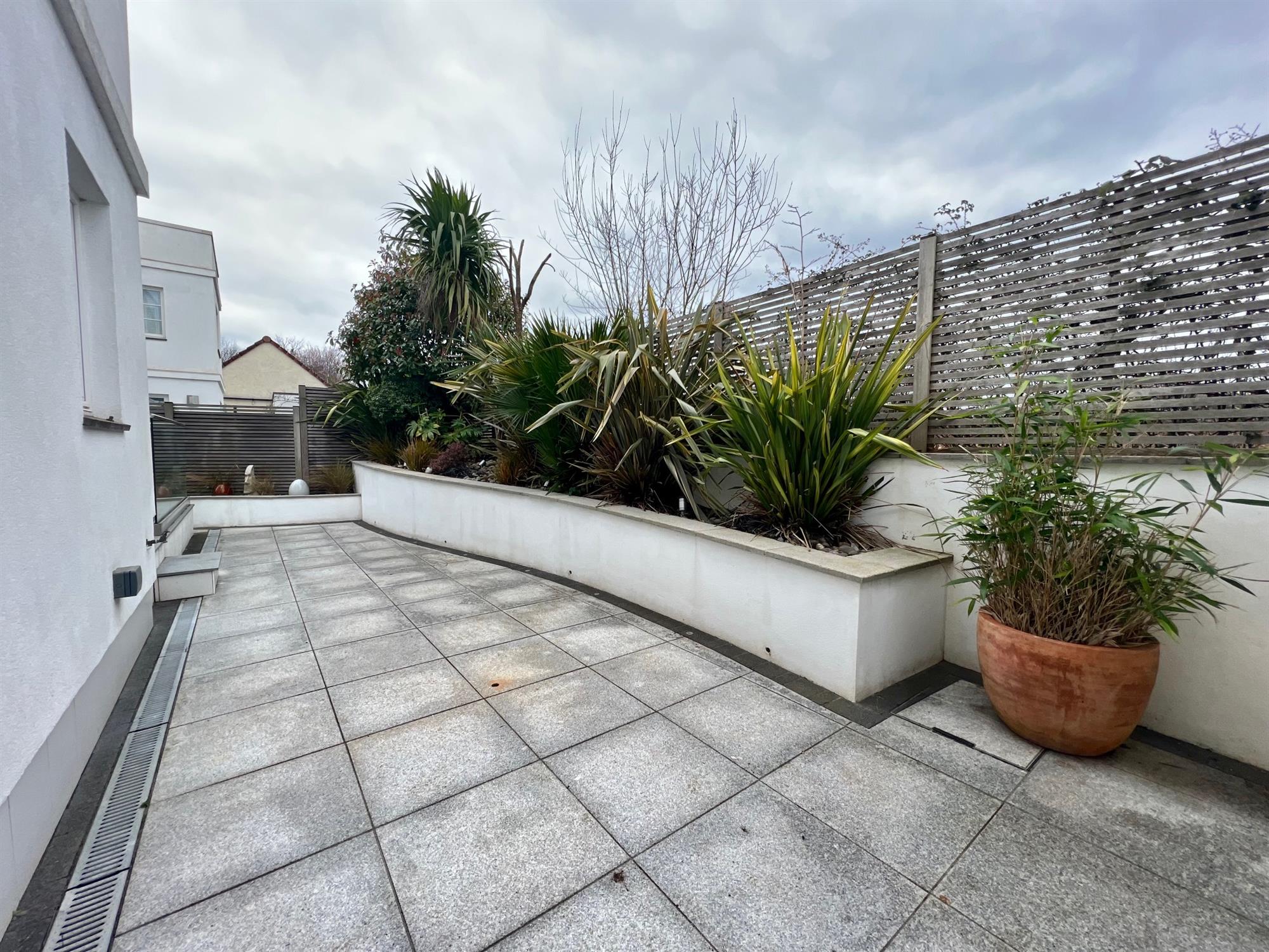 REARStylish paved low maintenance garden extending to the side of the property, fully enclosed with wall and fencing with a raised well stocked bed with a variety of attractive shrubs. Step down to a further paved patio area. Useful