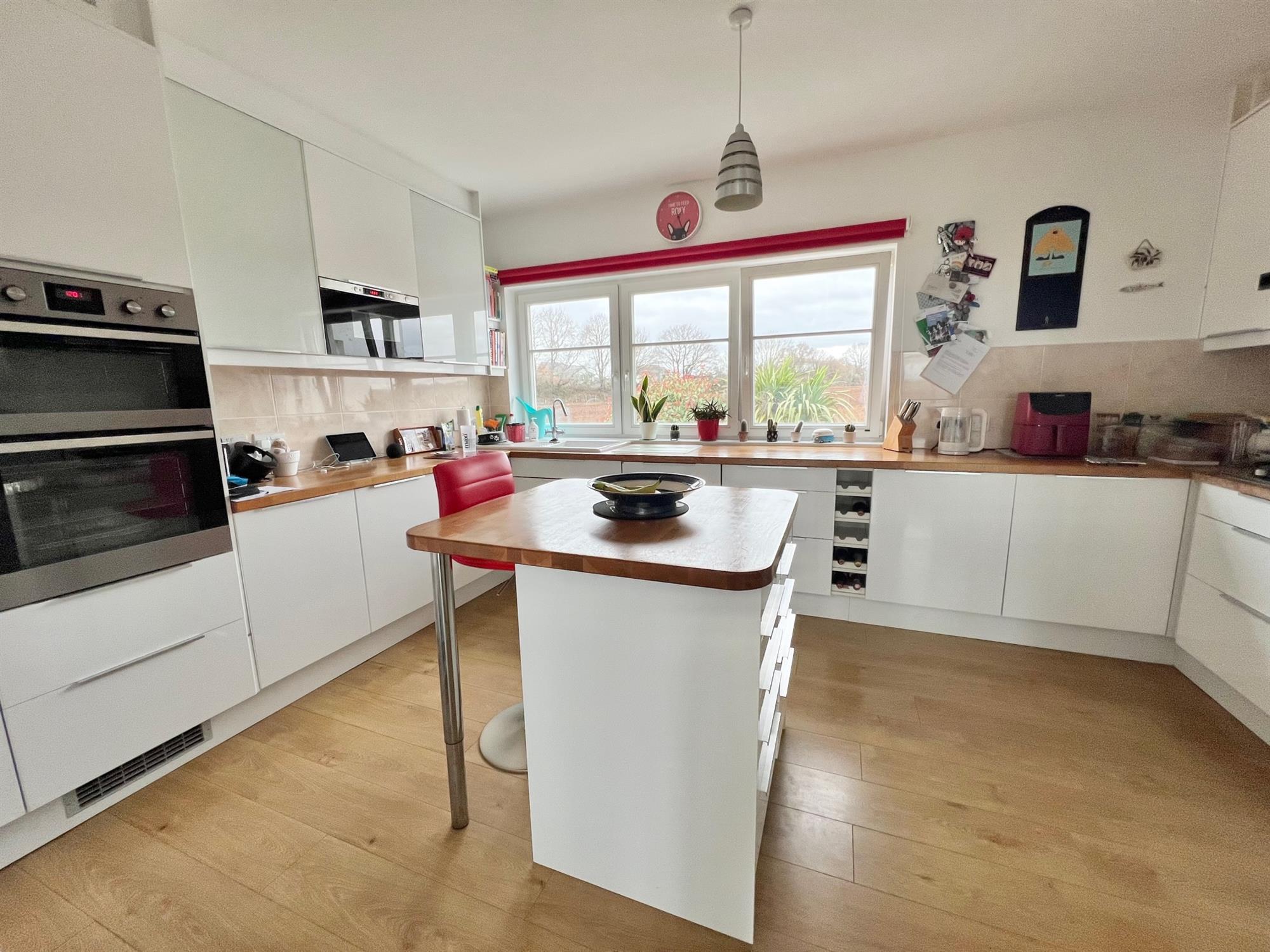 Opening Through To:-KITCHEN 14' 11" (4.55m) x 11' 9" (3.58m)Fitted with a range of base, wall and drawer units with a solid wood worktop over. Inset ceramic sink. Integrated fridge/freezer, high level oven and grill, dishwasher and microwave. Five ring gas hob. Central island unit with breakfast bar. Double glazed window to rear overlooking fields.