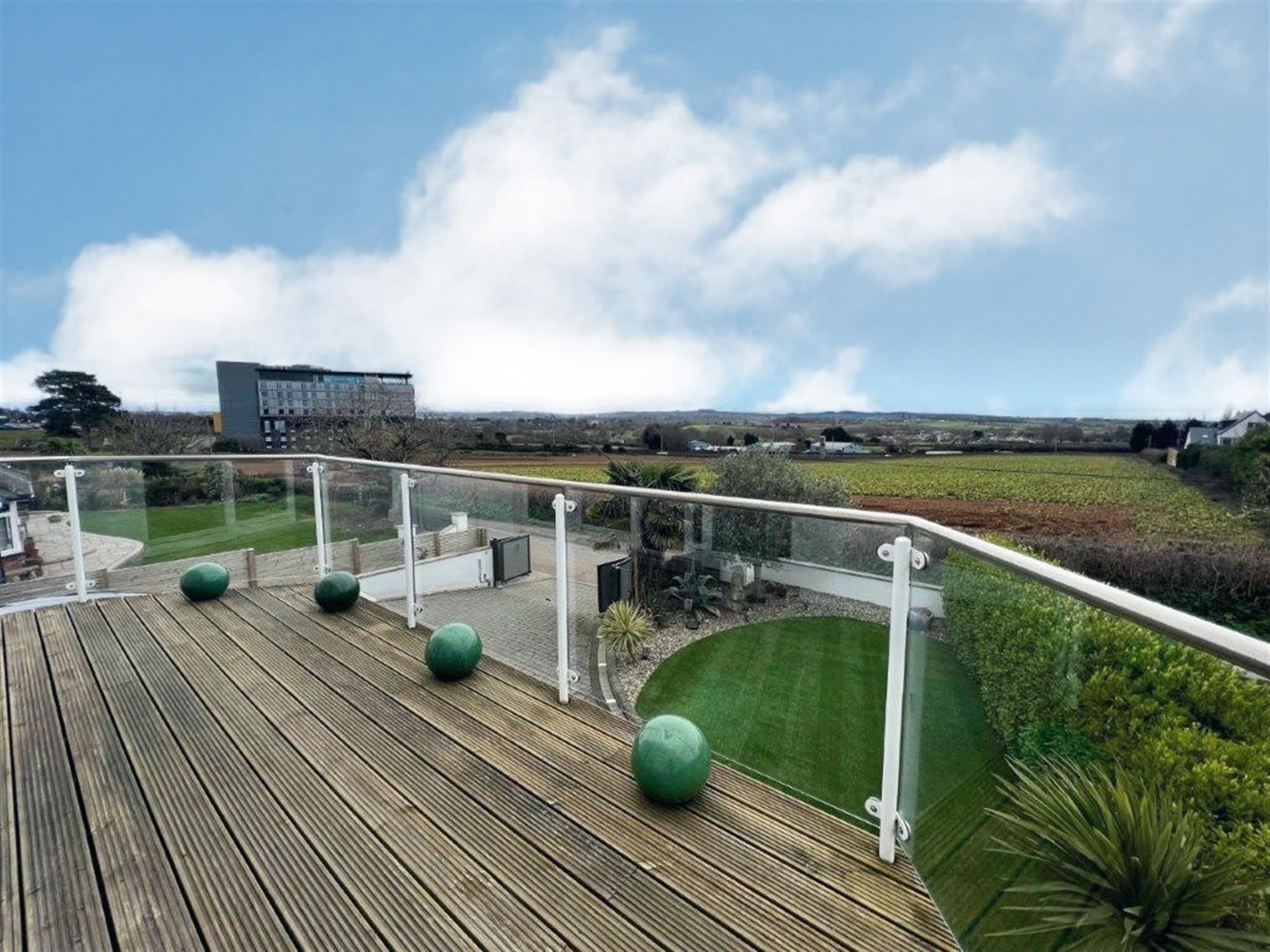 BALCONY 20' 6" (6.25m) x 7' 6" (2.29m)Wooden decking enclosed with a with stainless steel and glass balustrade enjoying the spectacular open outlook to the south, over countryside, looking towards Woodbury Castle.