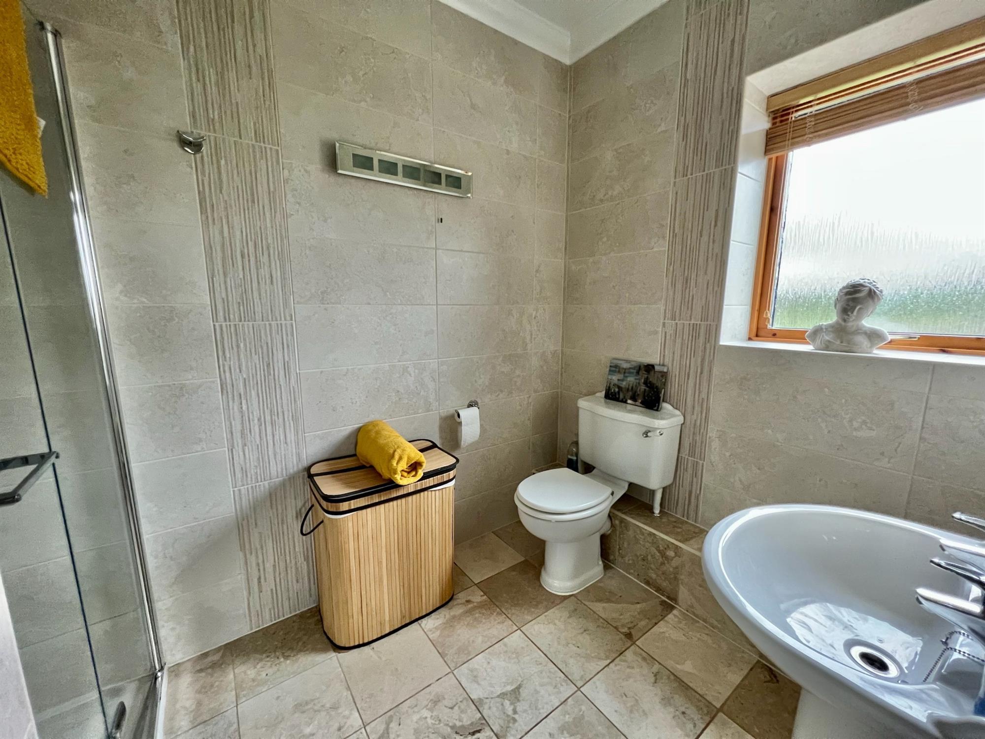 EN-SUITE: Oversized shower cubicle with split-fold glass door with built-in Grohe shower, low level WC and pedestal wash hand basin. Walls in full tiled surround. Tiled floor. Triple glazed opaque window to side. Coved ceiling. Downlighters. Built-in storage cupboard with shelving.