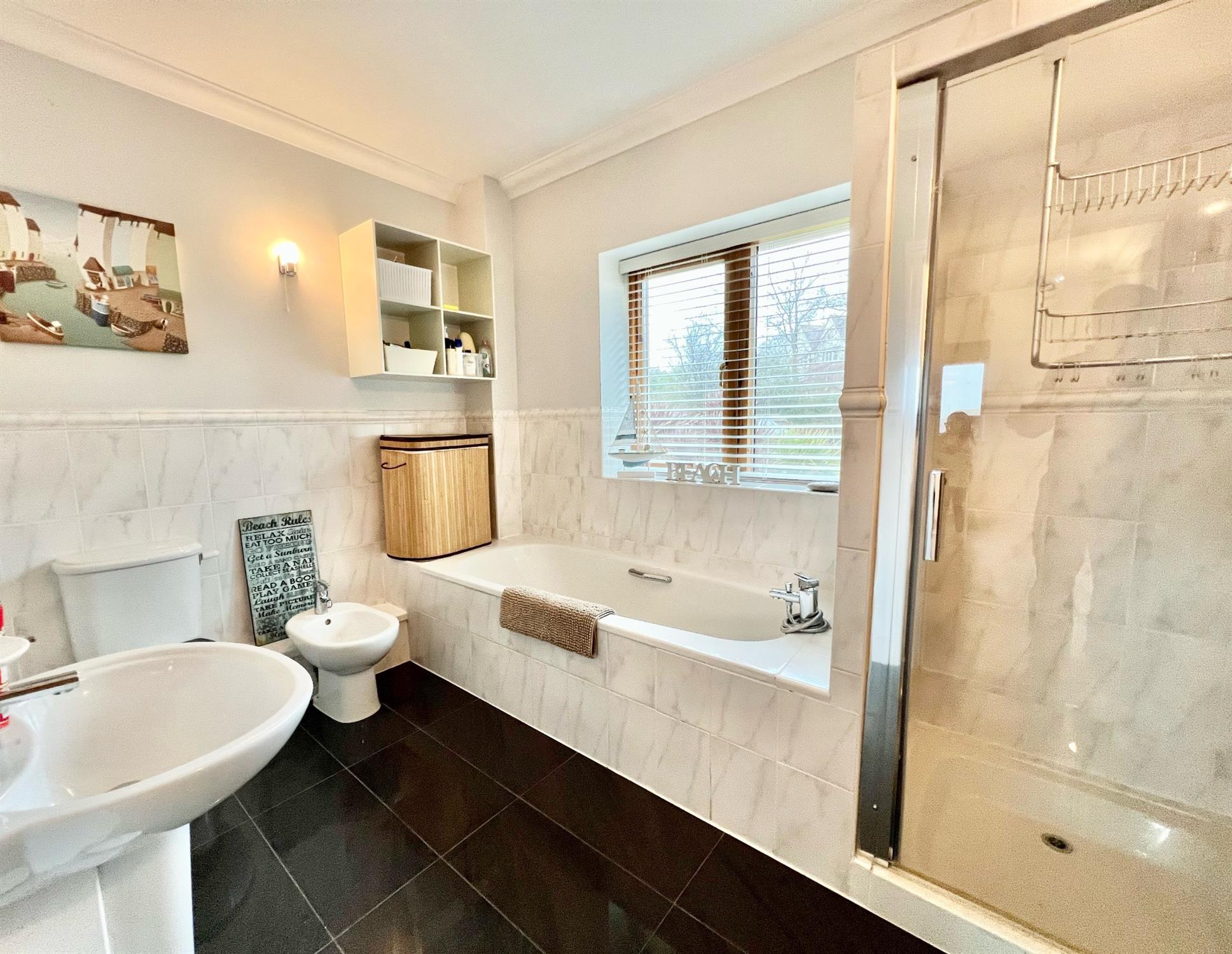 BATHROOM: Modern white suite comprising panelled bath with mixer shower tap with tiled splashback. Fully tiled shower cubicle with built-in shower unit. Low level WC. Bidet. Wash hand basin with mixer tap. Walls in half height tiled surround. Tiled floor. Triple glazed window to rear. Coved ceiling. Shaver point. Heated towel rail.
