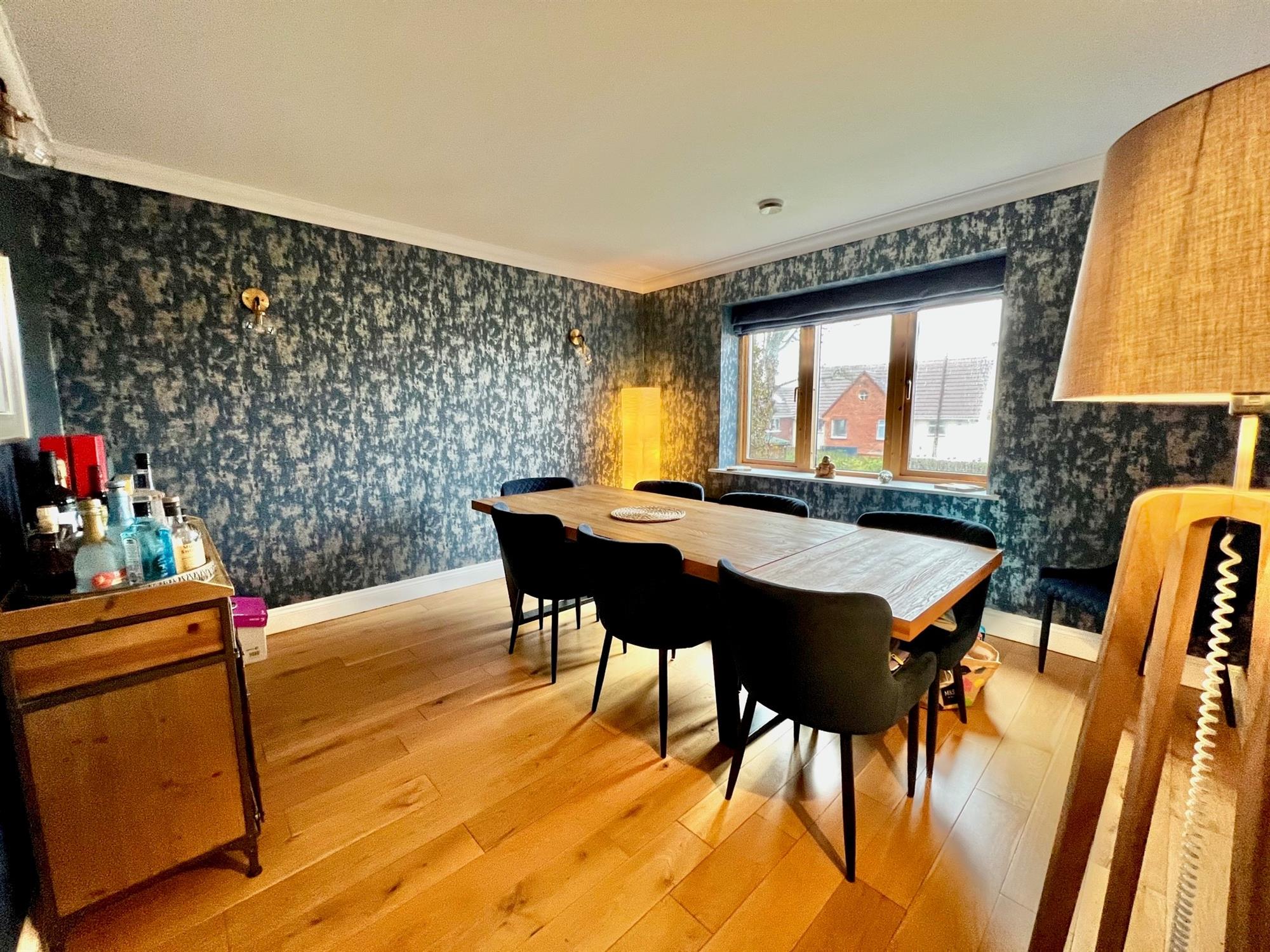 DINING ROOM: 12' 8" (3.86m) x 12' 6" (3.81m): Triple glazed window to front. Solid wood flooring. Coved ceiling. Radiator.