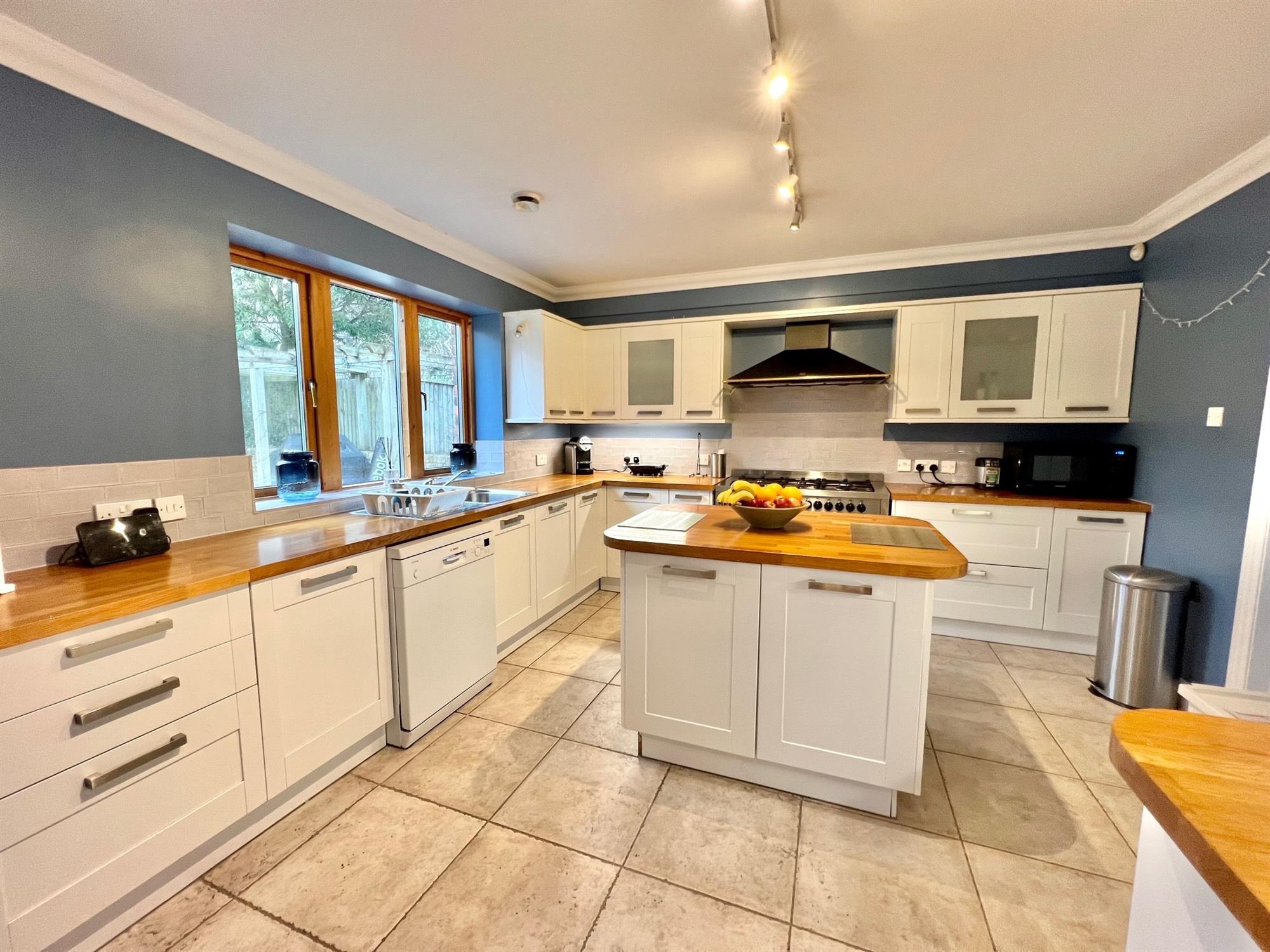 KITCHEN BREAKFAST ROOM: 22' 10" (6.96m) x 12' 6" (3.81m): Open plan room with outlook over the rear garden. The dining area has triple glazed double doors leading out onto the rear garden. Coved ceiling. Downlighters. Solid wood flooring. This leads through to the kitchen area which has a modern fitted Shaker style kitchen with tiled floor. Solid wood worktop surface with cupboards and drawers under with space for dishwasher and Range style cooker. Space for fridge freezer. Inset stainless steel on and a half bowl sink with drainer and mixer tap. Matching wall mounted cupboards with underlighting. Fitted cooker hood with underlighting. Central island unit with matching worktop with cupboards under. Integrated corner carousel unit. Kick-space heater. Coved ceiling. Triple glazed window to the rear. Door to...