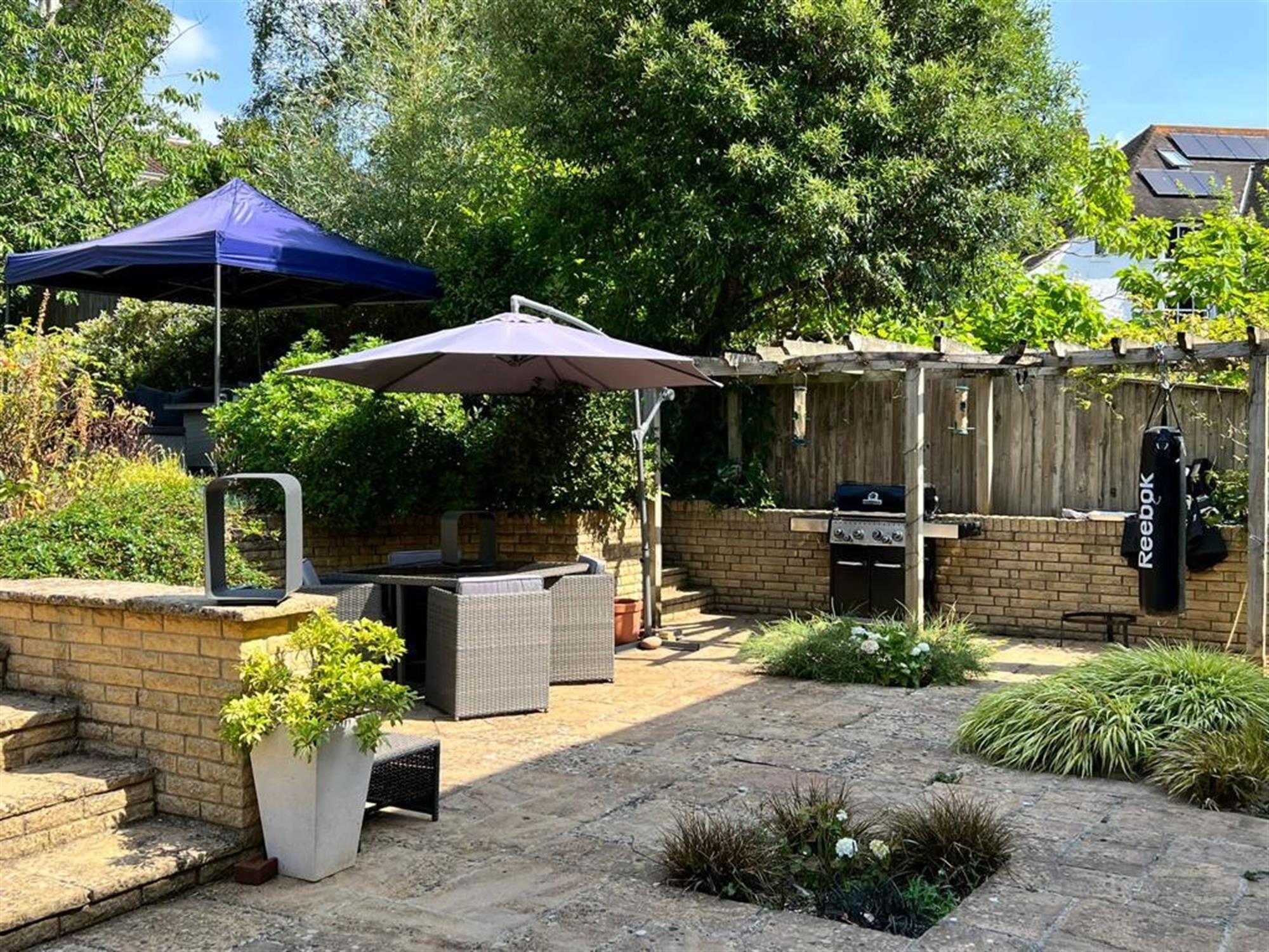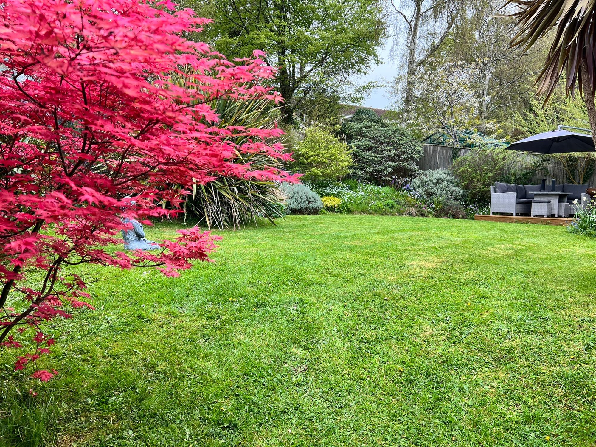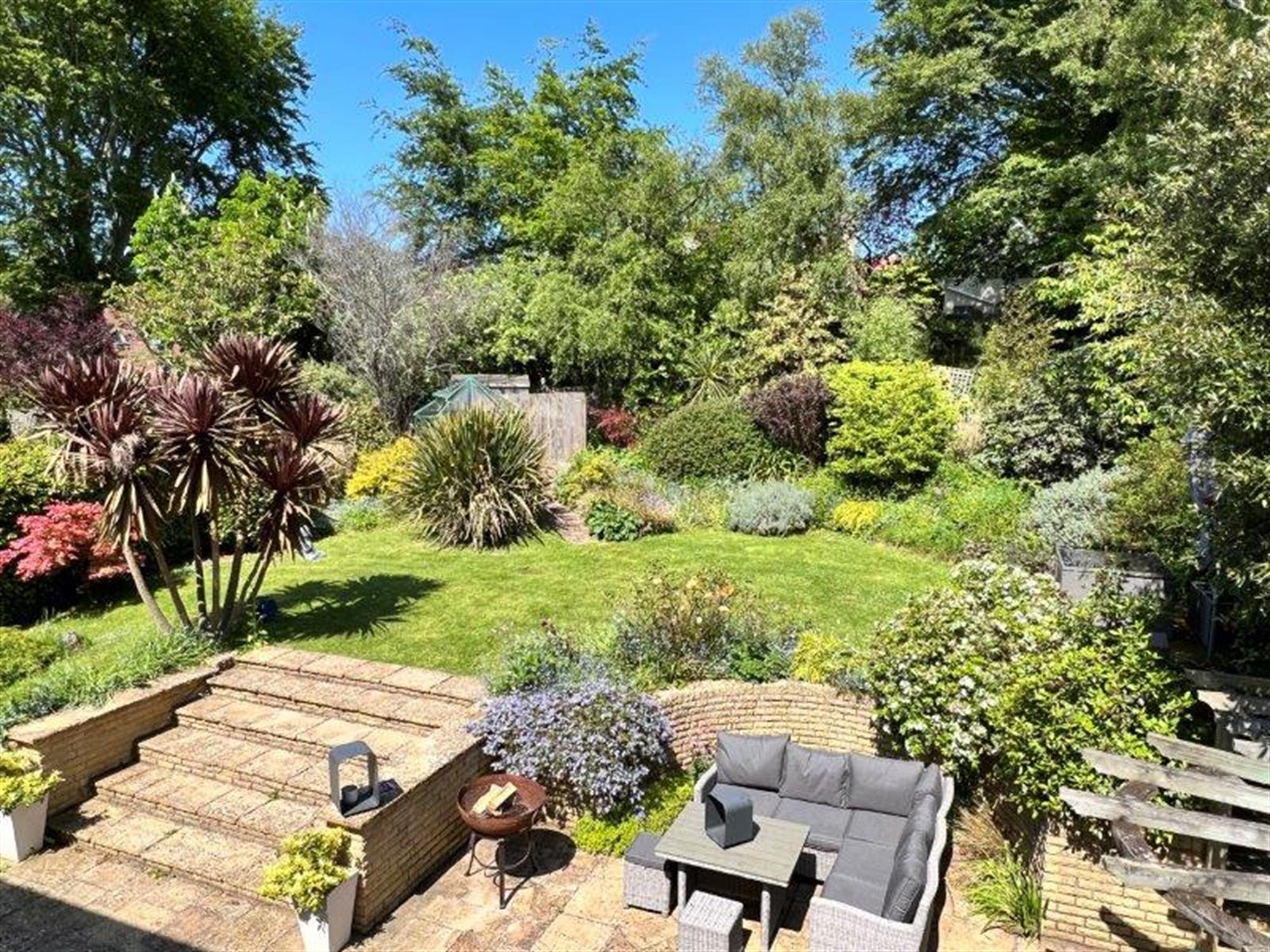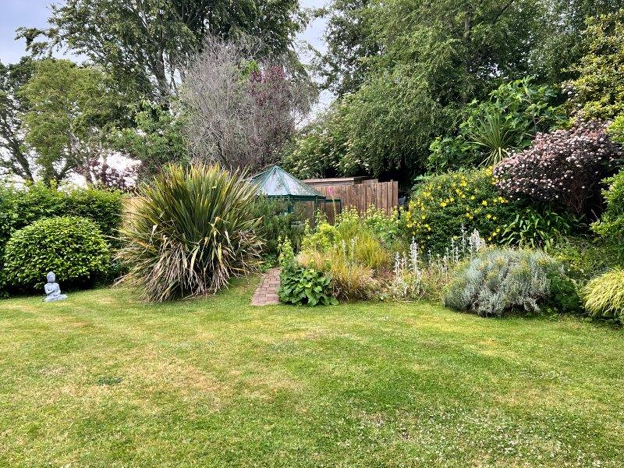 GREENHOUSE and STORAGE SHED and a further decked seating area. The garden has a variety of shrubs and a gate, making it secure for pets.