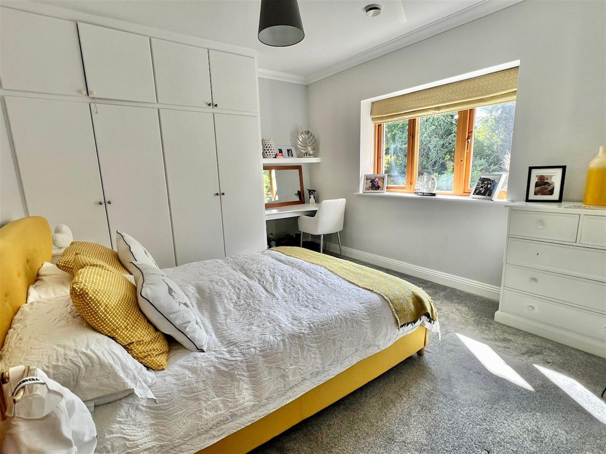 BEDROOM 4: 12' 6" (3.81m) x 11' 2" (3.40m): Triple glazed window to rear. Two triple built-in wardrobes with cupboards above. Fitted corner desk unit. Coved ceiling.