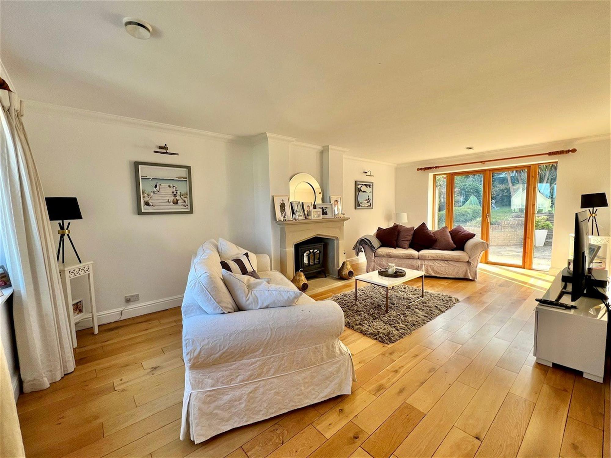 SITTING ROOM: 23' 2" (7.06m) x 13' 2" (4.01m): A large bright spacious room with triple glazed window to front and triple glazed windows and double doors to the rear. Feature Minster stone fireplace with matching hearth with electric cast iron stove. Solid wood flooring. Coved ceiling.