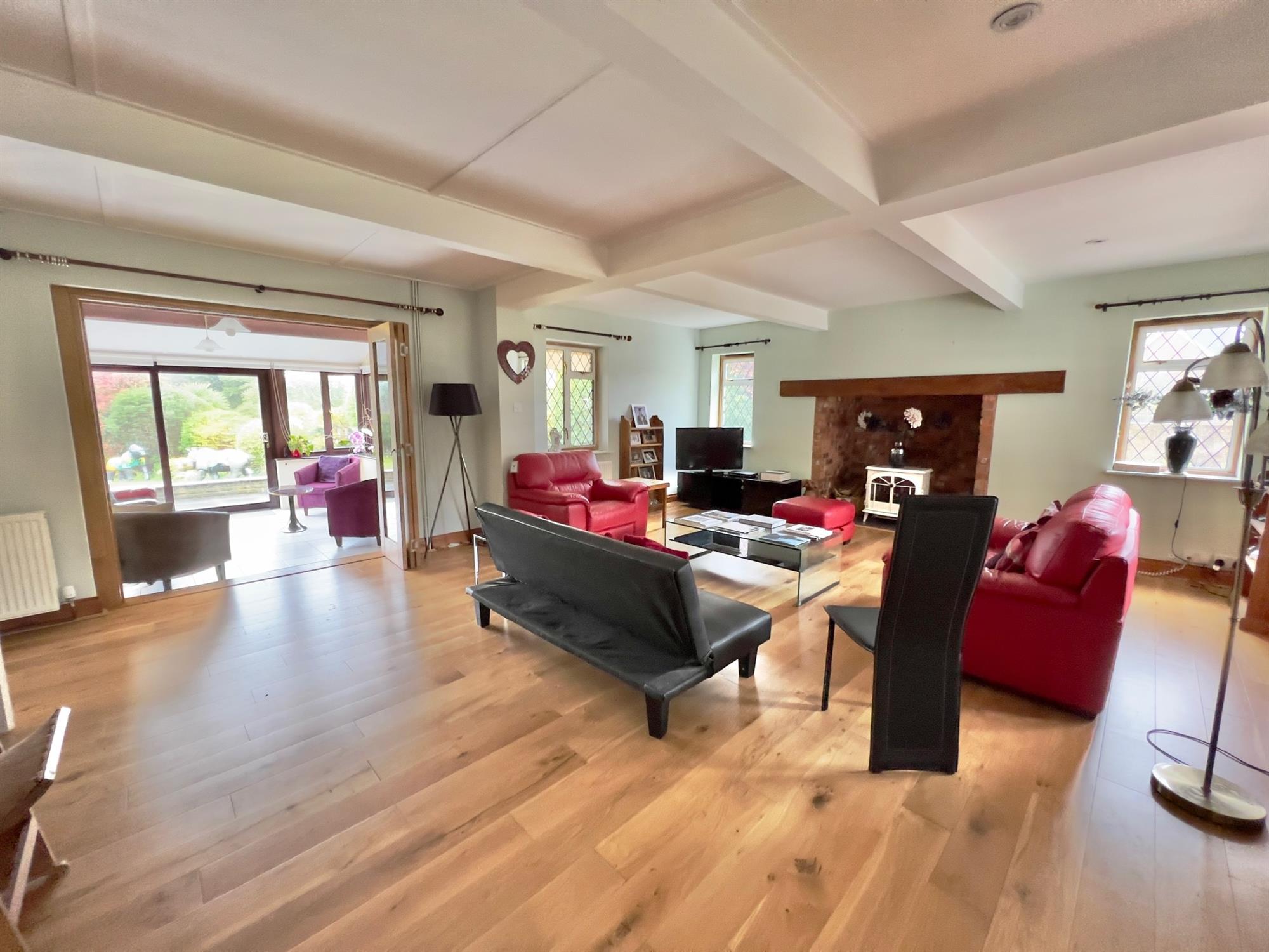 SITTING ROOM: 25' 2" (7.67m) x 18' (5.49m): A particularly large room with double glazed leaded windows to the side, front and rear. Solid wood flooring throughout. Feature Inglenook fireplace with heavy beam and electric effect fire.Four radiators. Downlighters. Glazed double doors looking through to dining room. Glazed bi-fold doors leading through to the...