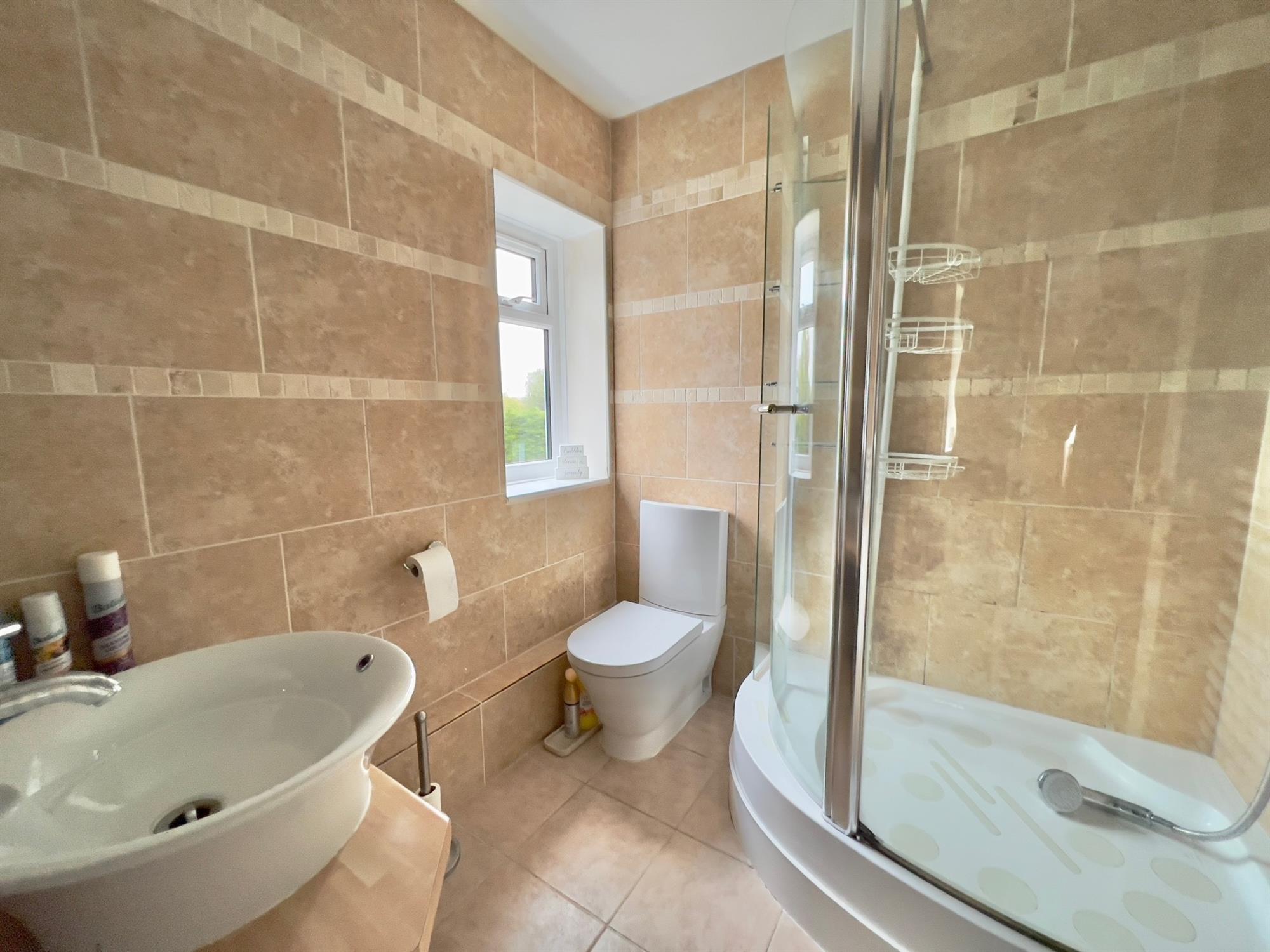 EN-SUITE: 6' 5" (1.96m) x 6' 2" (1.88m): Large corner shower cubicle with built-in Mira shower. Low level WC. Circular wash hand basin with mixer tap. Walls and floor in full tiled surround. Double glazed window to side. White runged radiator.