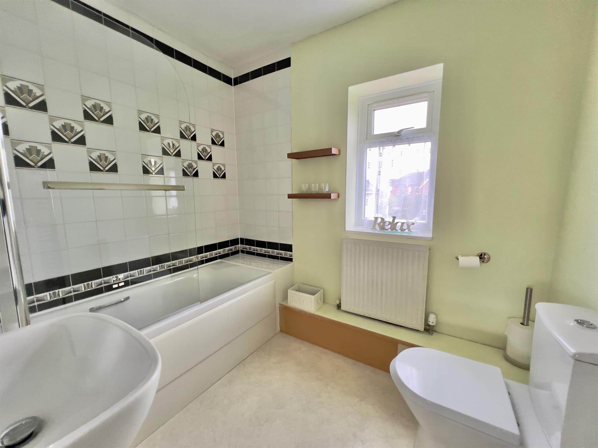 EN-SUITE BATHROOM: 7' 7" (2.31m) x 6' 5" (1.96m): White suite comprising panelled bath in full tiled surround with mixer shower tap and electric shower with glass screen. Low level WC. Pedestal wash hand basin with mixer tap. Double glazed window to side. Chrome runged radiator.