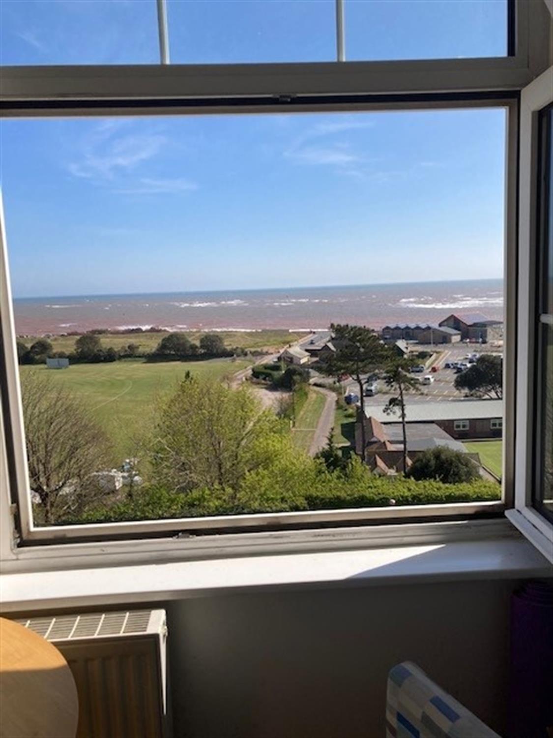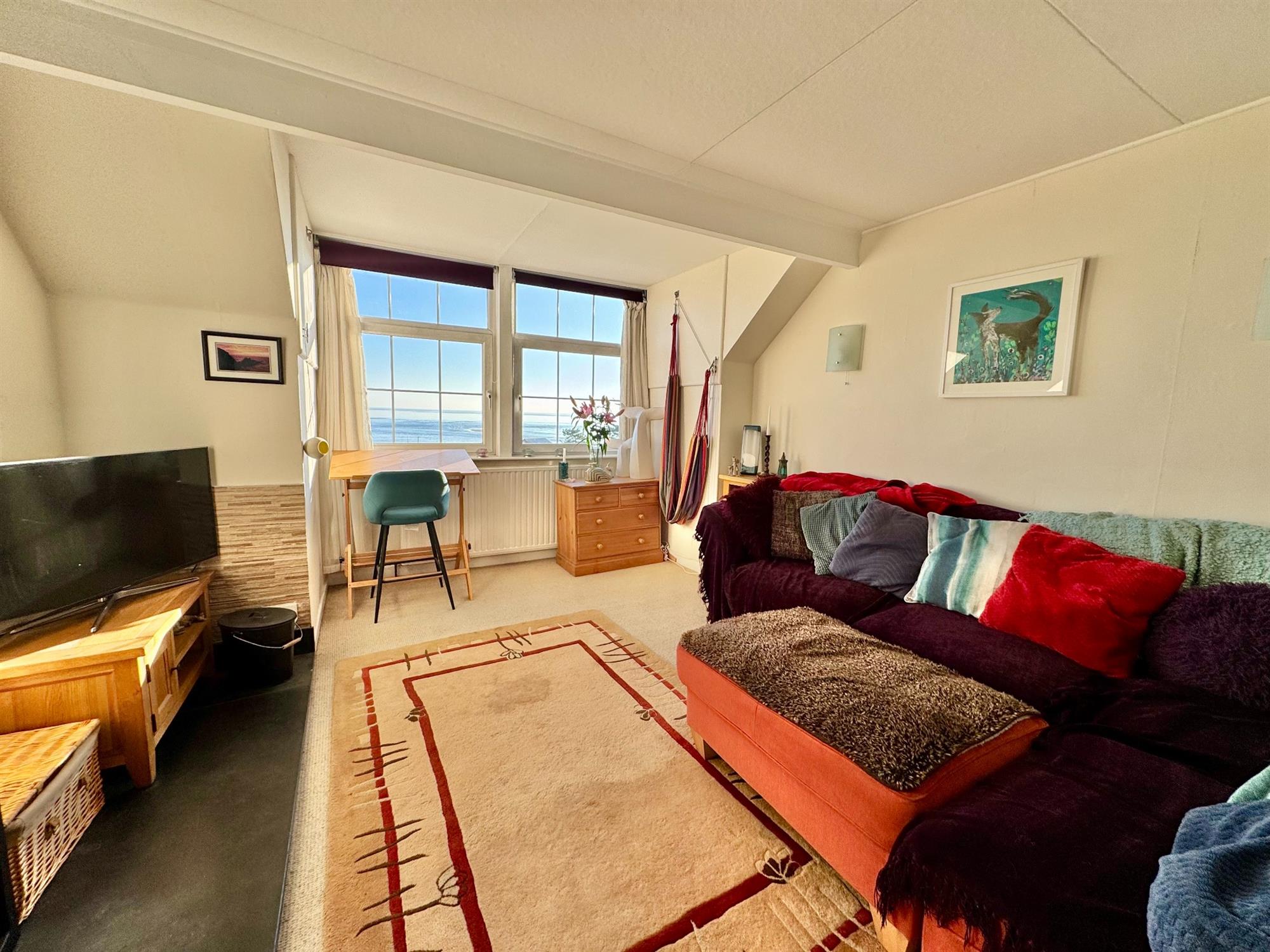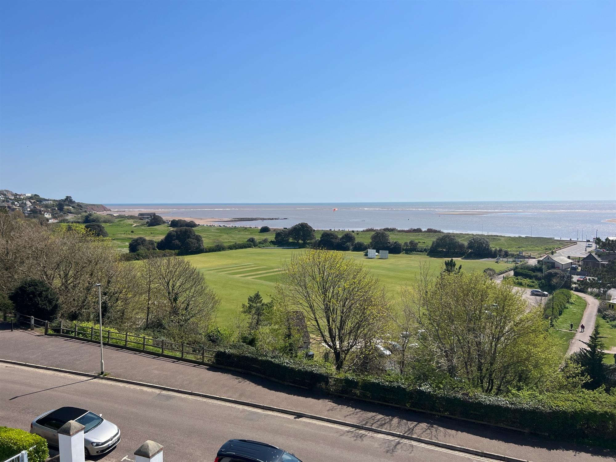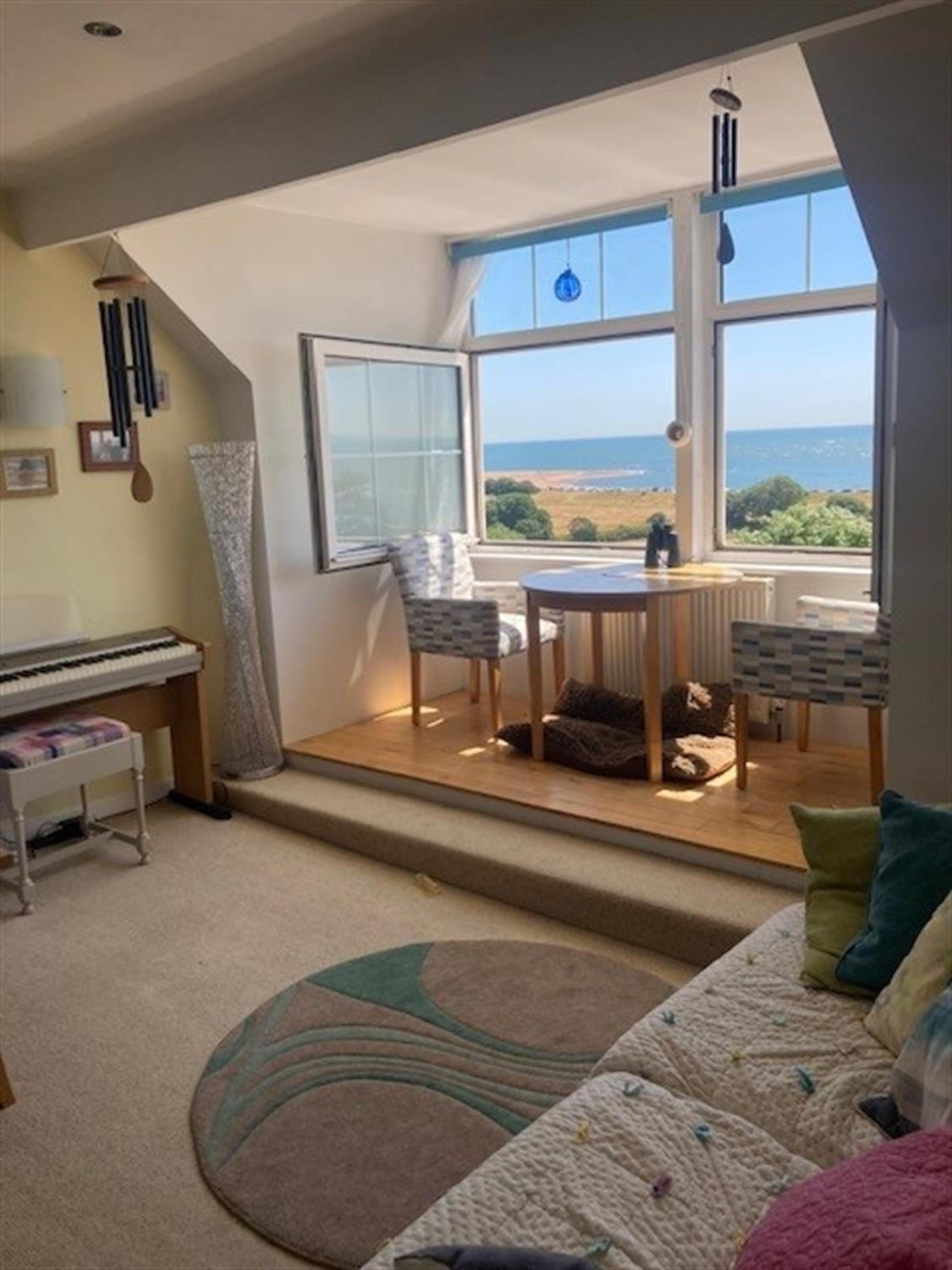 SITTING ROOM: 15' 4" (4.67m) x 14' 8" (4.47m): Two large fully opening double glazed windows to the front of the building, again with views across the Cricket Ground, Exmouth Beach, the sea and Dawlish Warren. Radiator. Cast iron woodburner with tiled surround and Welsh slate hearth.