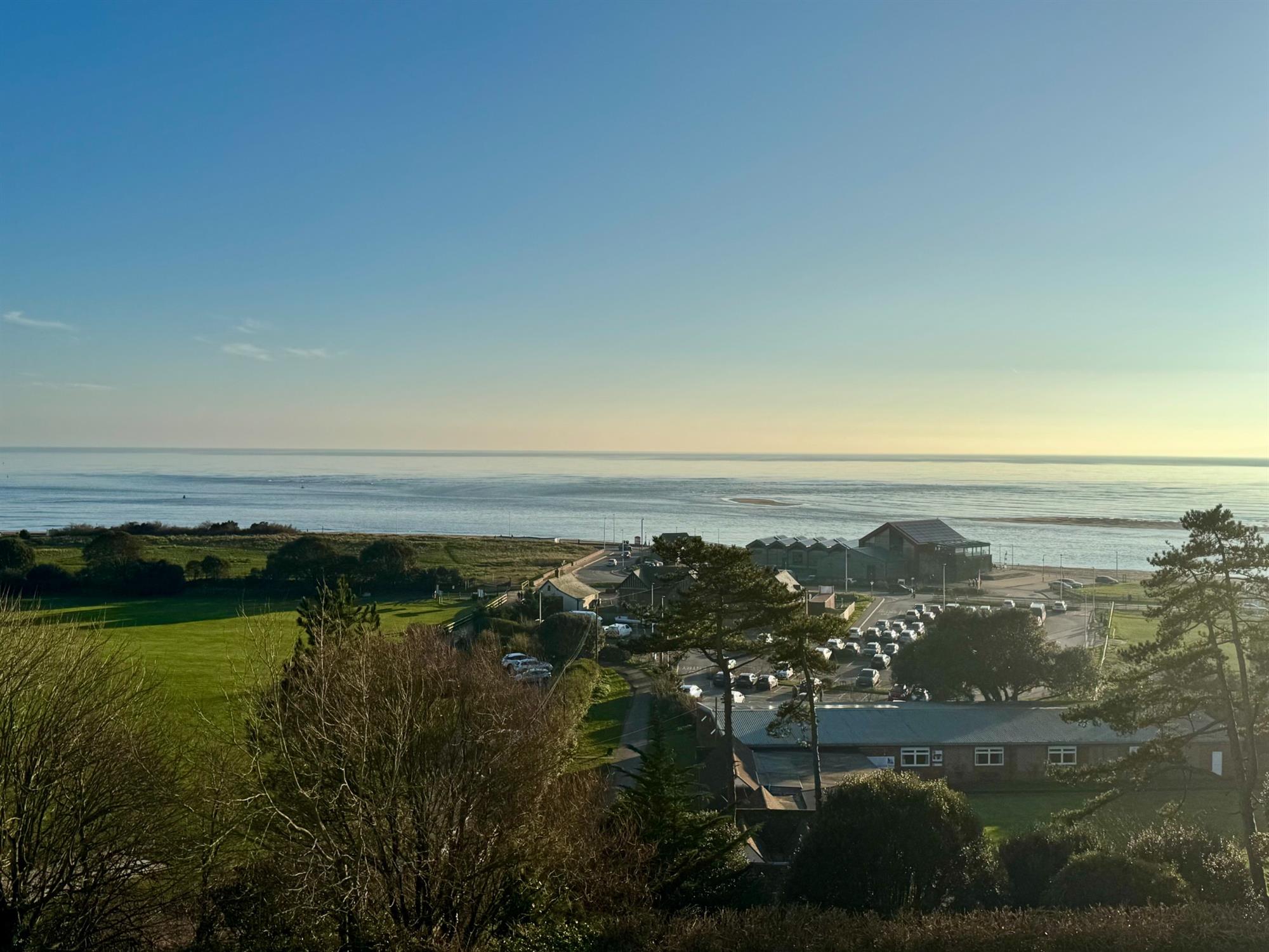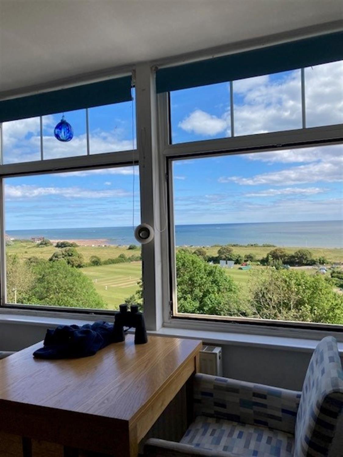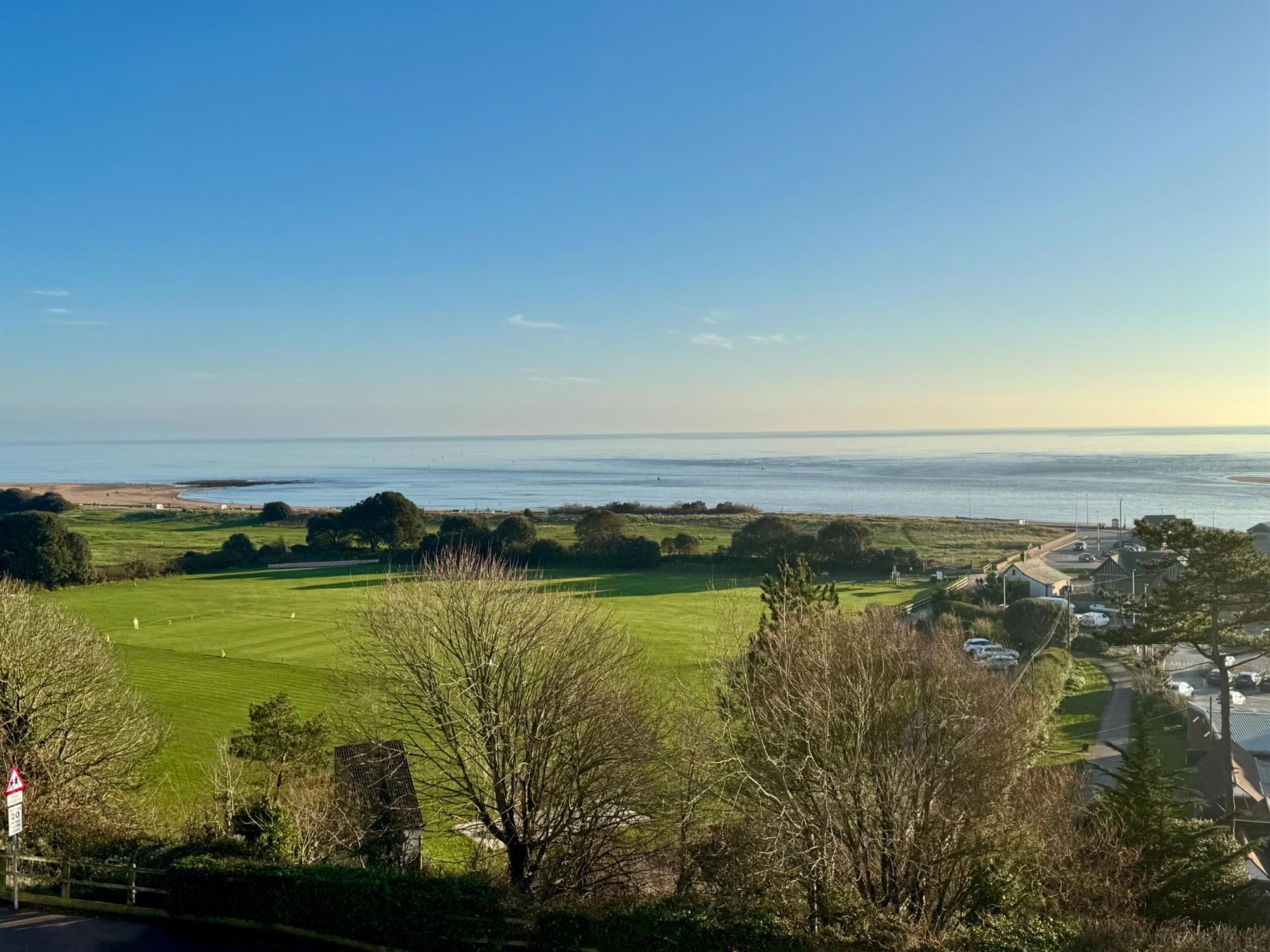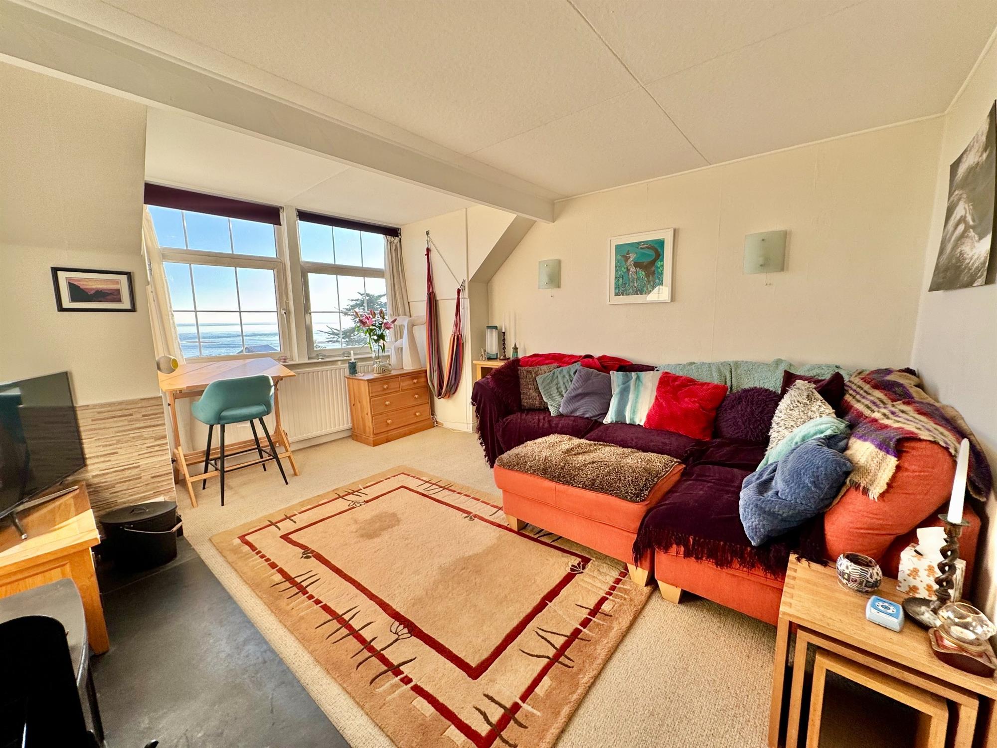 SITTING ROOM: 15' 4" (4.67m) x 14' 8" (4.47m): Two large fully opening double glazed windows to the front of the building, again with views across the Cricket Ground, Exmouth Beach, the sea and Dawlish Warren. Radiator. Cast iron woodburner with tiled surround and Welsh slate hearth.