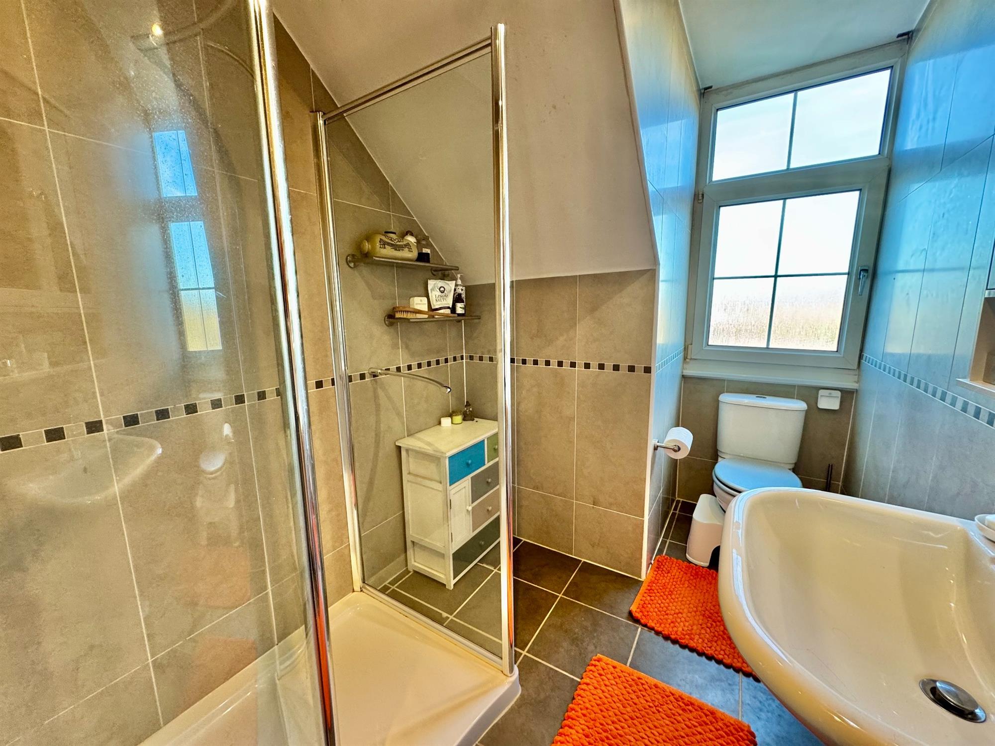SHOWER ROOM: 12' 4" (3.76m) x 8' 4" (2.54m): Modern white suite comprising fully tiled walk-in shower with built-in shower unit. Low level WC. Pedestal wash hand basin with mixer tap. Walls in full tiled surround. Tiled floor. Opaque double glazed window to rear. Chrome runged radiator. Fitted mirrored medicine cabinet. Downlighters. Extractor fan.