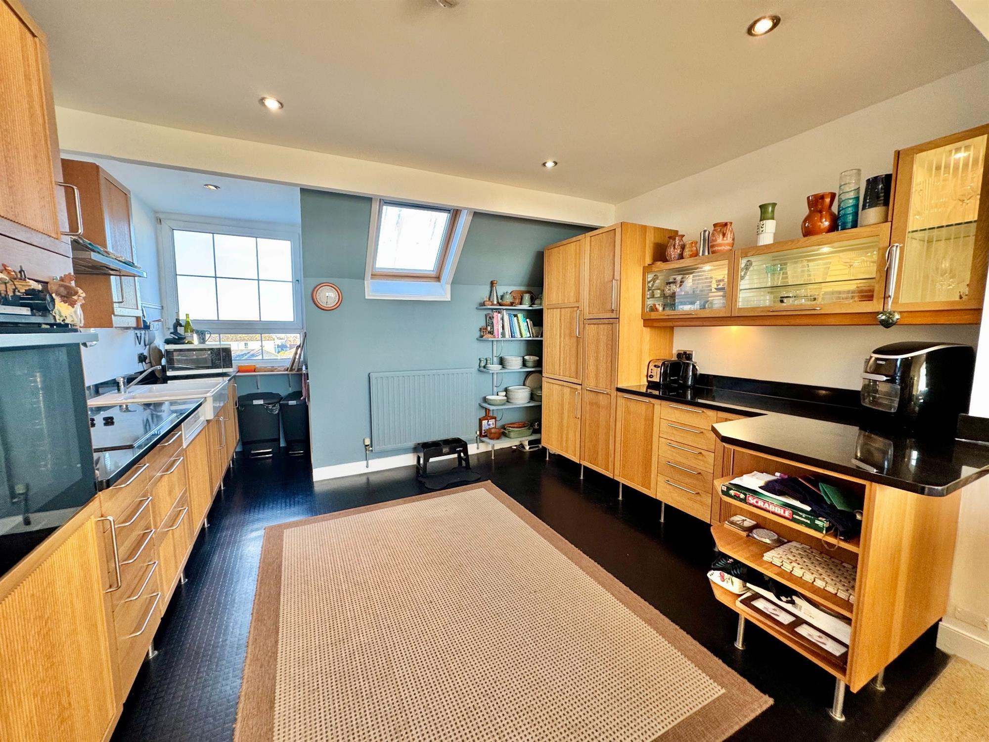 KITCHEN AREA: 14' 8" (4.47m) x 12' 10" (3.91m): The kitchen has modern Oak front units with granite worktop surfaces with matching up stands. Inset twin induction and twin gas hob. Belfast sink with double bowl and mixer tap. Oak fronted cupboards and drawers under with stainless steel handles. Integrated dishwasher. Built-in oven, fridge and freezer. Pull out larder units and corner display shelving. Matching wall mounted cupboards with under lighting and stainless steel cooker hood. Downlighters. Double glazed window to the rear with views across the Exe Estuary. Double glazed Velux window. Radiator.