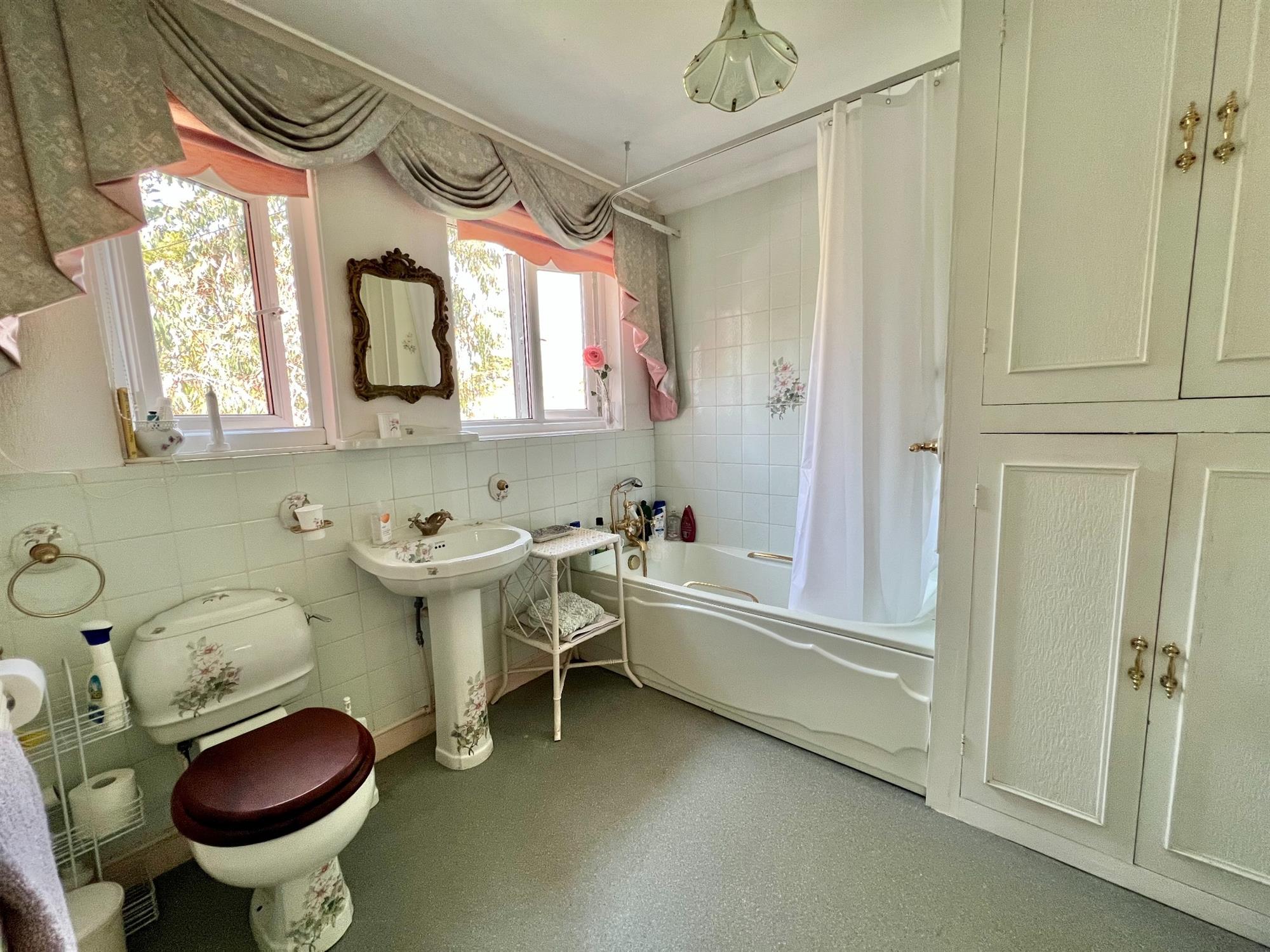 BATHROOM 10' 11" (3.33m) x 8' 6" (2.59m)Panelled bath in full tiled surround with Victorian style mixer shower tap. Pedestal wash hand basin. Low level W.C. Two double glazed windows to the front. Shaver point. Runged radiator. Built-in double storage cupboard housing the factory lagged copper cylinder.