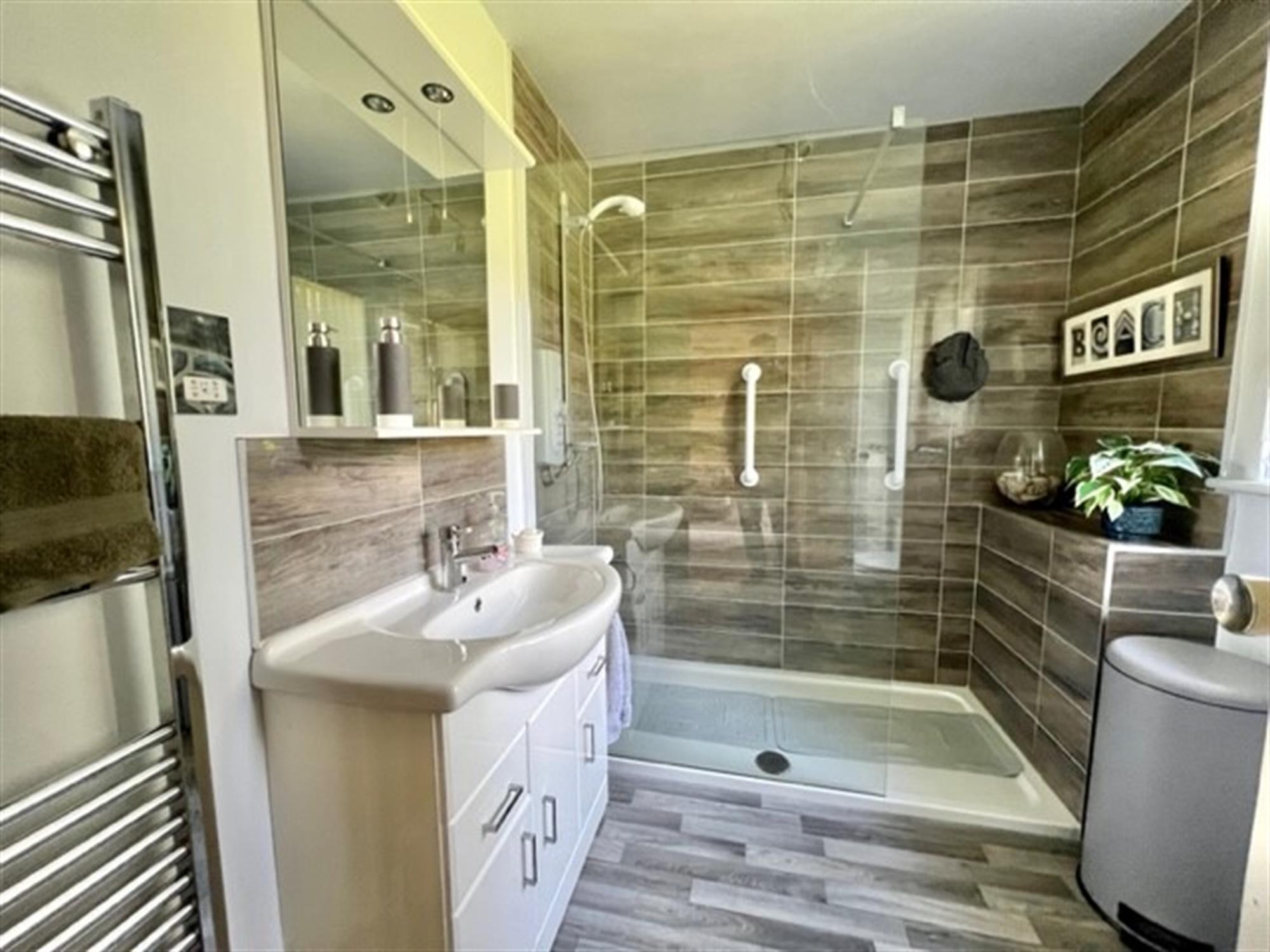 EN-SUITE SHOWER ROOM 8' 6" (2.59m) x 6' 4" (1.93m)Modern white suite comprising:- large walk-in shower cubicle in full tiled surround with glass screen and Mira electric shower. Wash hand basin with mixer tap in tiled splashback with storage under. Fitted vanity mirror with light over. Low level W.C. Double glazed window to the front. Chrome runged radiator.