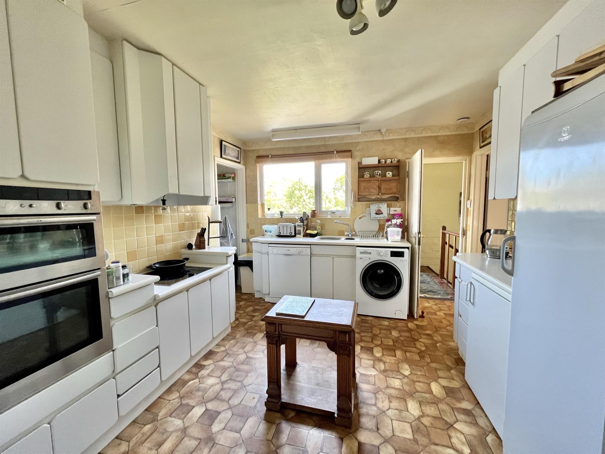 KITCHEN 14' (4.27m) x 10' 9" (3.28m)White worktop surfaces with tiled splashbacks. Door leading back to the Reception Hall. Door leading through to the stairwell. Double glazed window to the side. White 1½ bowl sink with drainer and mixer tap. Space for dishwasher, washing machine, fridge and freezer. Built-in storage cupboards. Base and wall units. Built-in double oven. Neff ceramic hob. Radiator. Opening through to:-