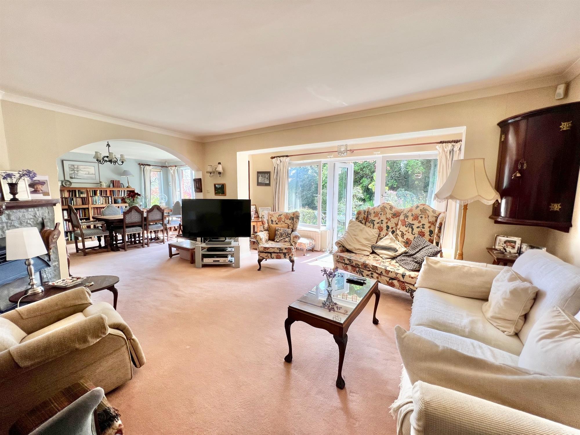 SITTING ROOM 17' (5.18m) x 16' (4.88m)A lovely large bright room with double glazed windows to the rear and to the side, with stunning views over the gardens, across to the beach and sea. Double glazed double doors leading out onto the rear patio. Corner feature fireplace with gas fire. Coved ceiling. Two radiators. Archway leading through to:-