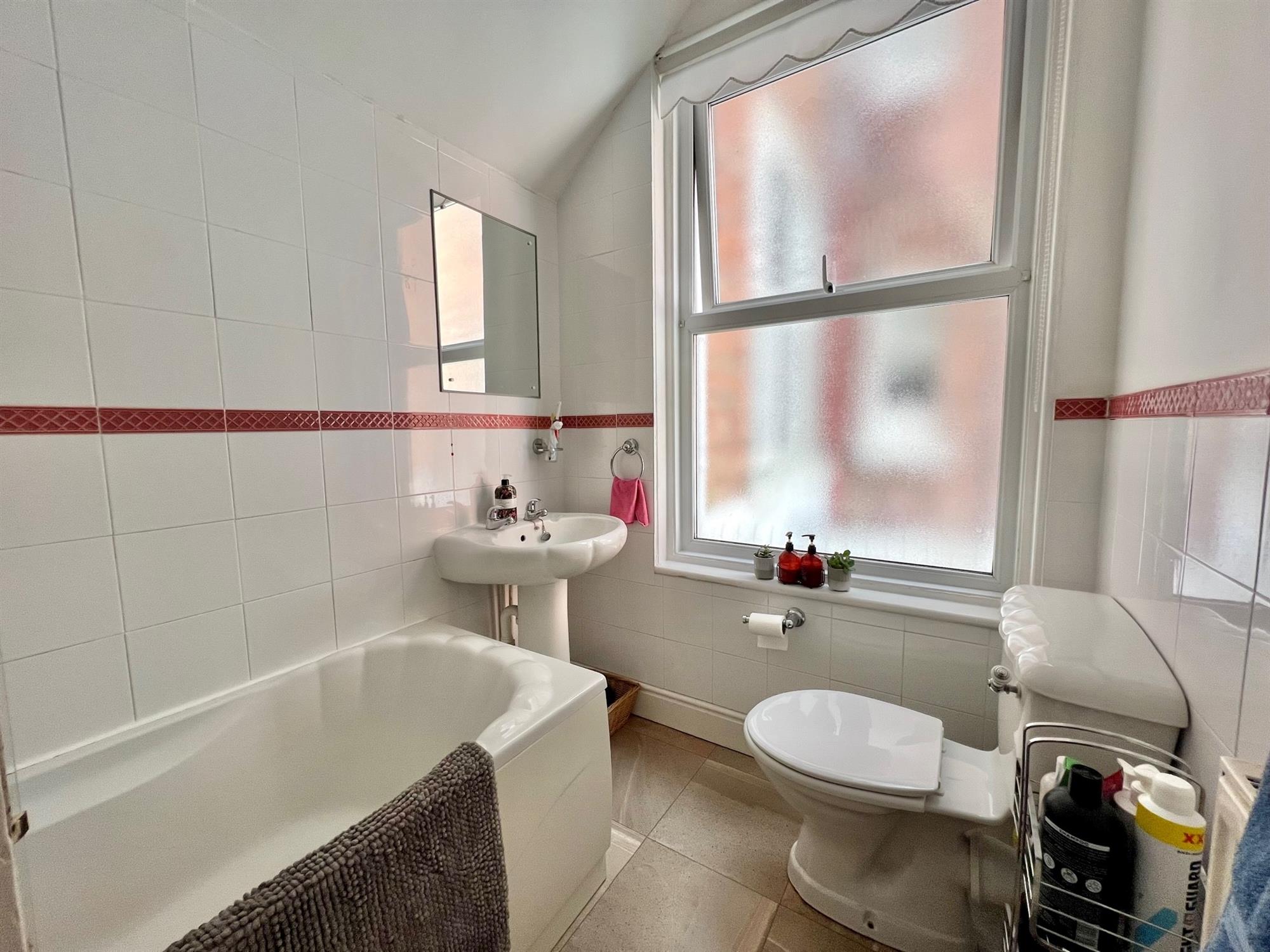 BATHROOM: 7' 8" (2.34m) x 6' 3" (1.91m): White suite comprising panelled bath in full tiled surround with built-in mixer shower tap and glass screen. Pedestal wash hand basin. Low level WC. Opaque double glazed window to side. Shaver point. Radiator. Stone effect flooring.