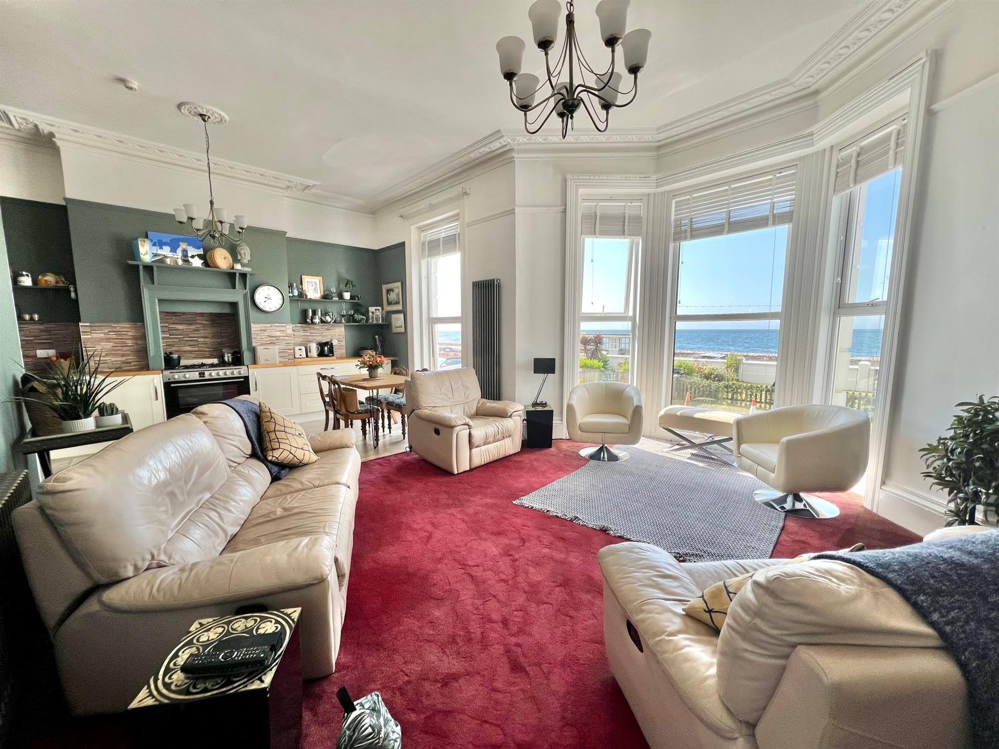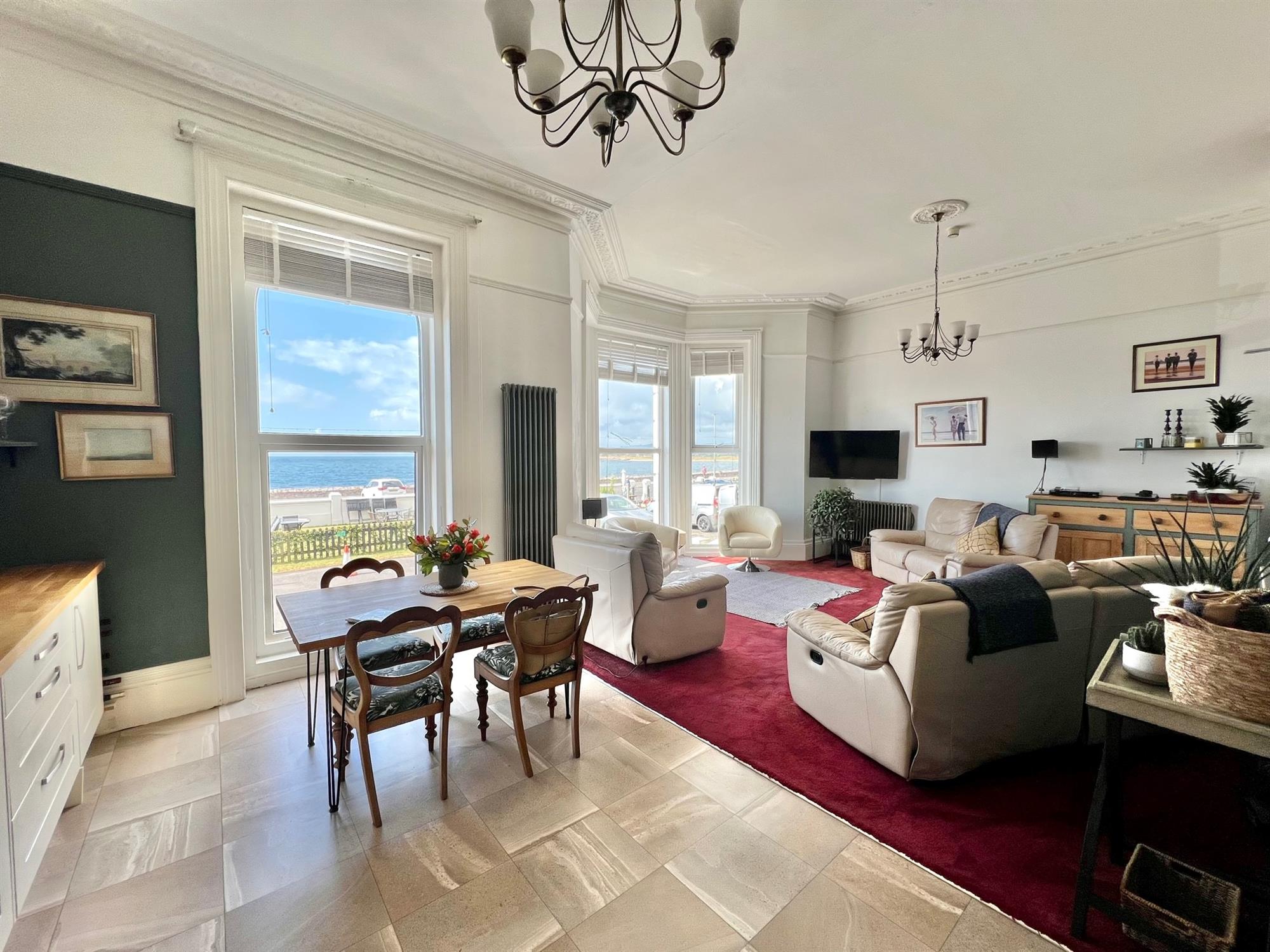 OPEN PLAN SITTING / DINING / KITCHEN 26' 2" (7.98m) x 19' 9" (6.02m): Large open plan room with very high ceilings and decorative coving. Large double glazed bay window and further double glazed window with views directly over the sea and towards Berry Head. Three old fashioned style radiators.