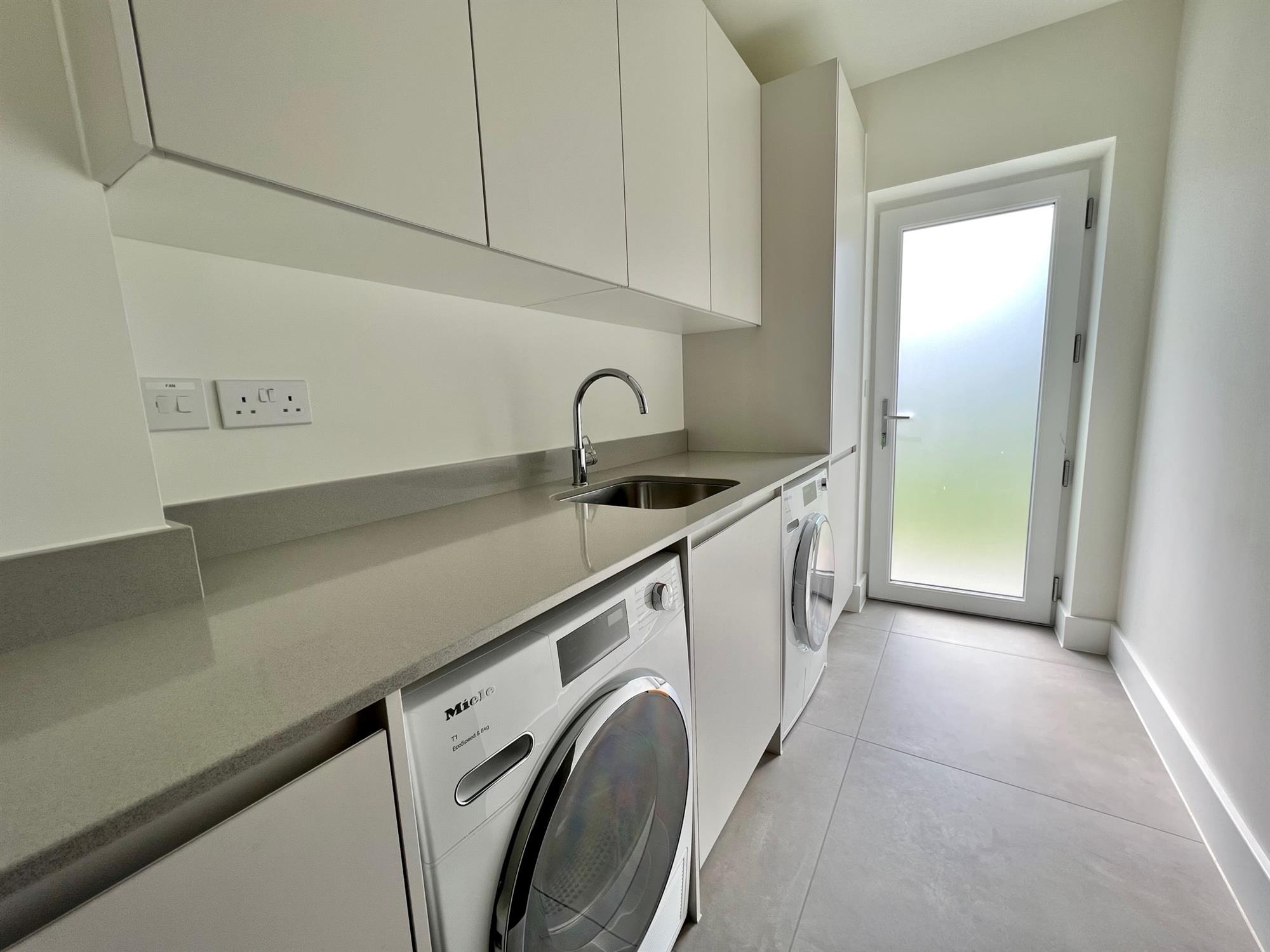 UTILITY ROOM 9' (2.74m) x 5' 5" (1.65m)Matching stone worktop surface with splashback. Stainless steel sink with mixer tap. Cupboards under with space for washing machine and tumble dryer. Further matching storage and wall mounted cupboards. Opaque double glazed door leading to the rear. Tiled floor with underfloor heating.