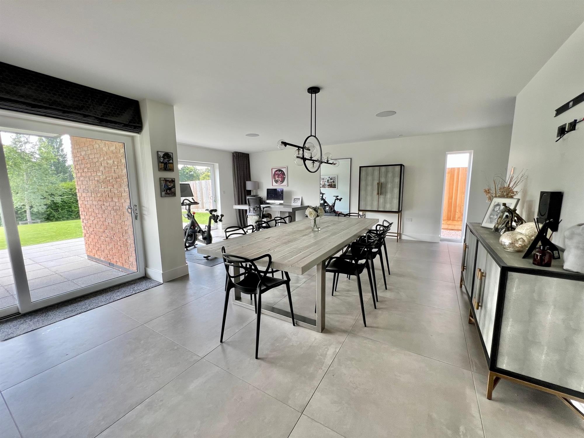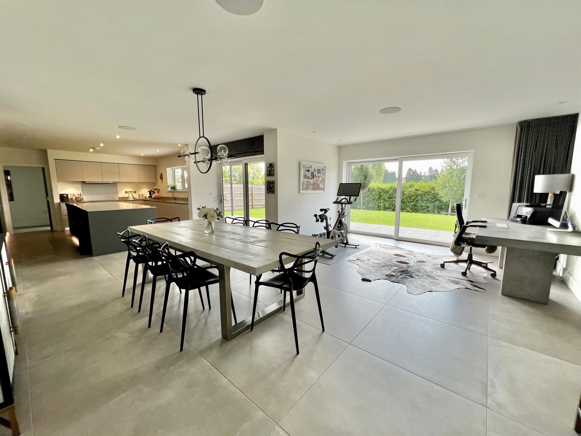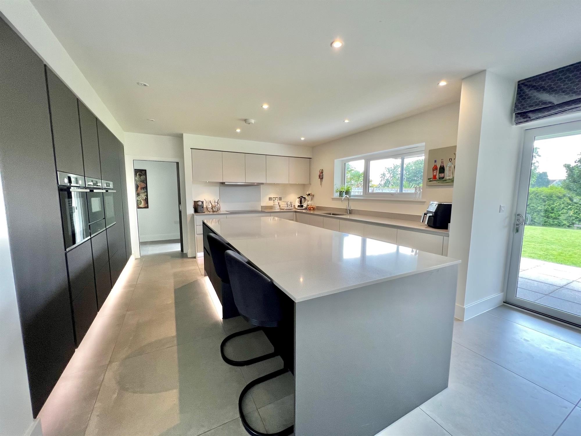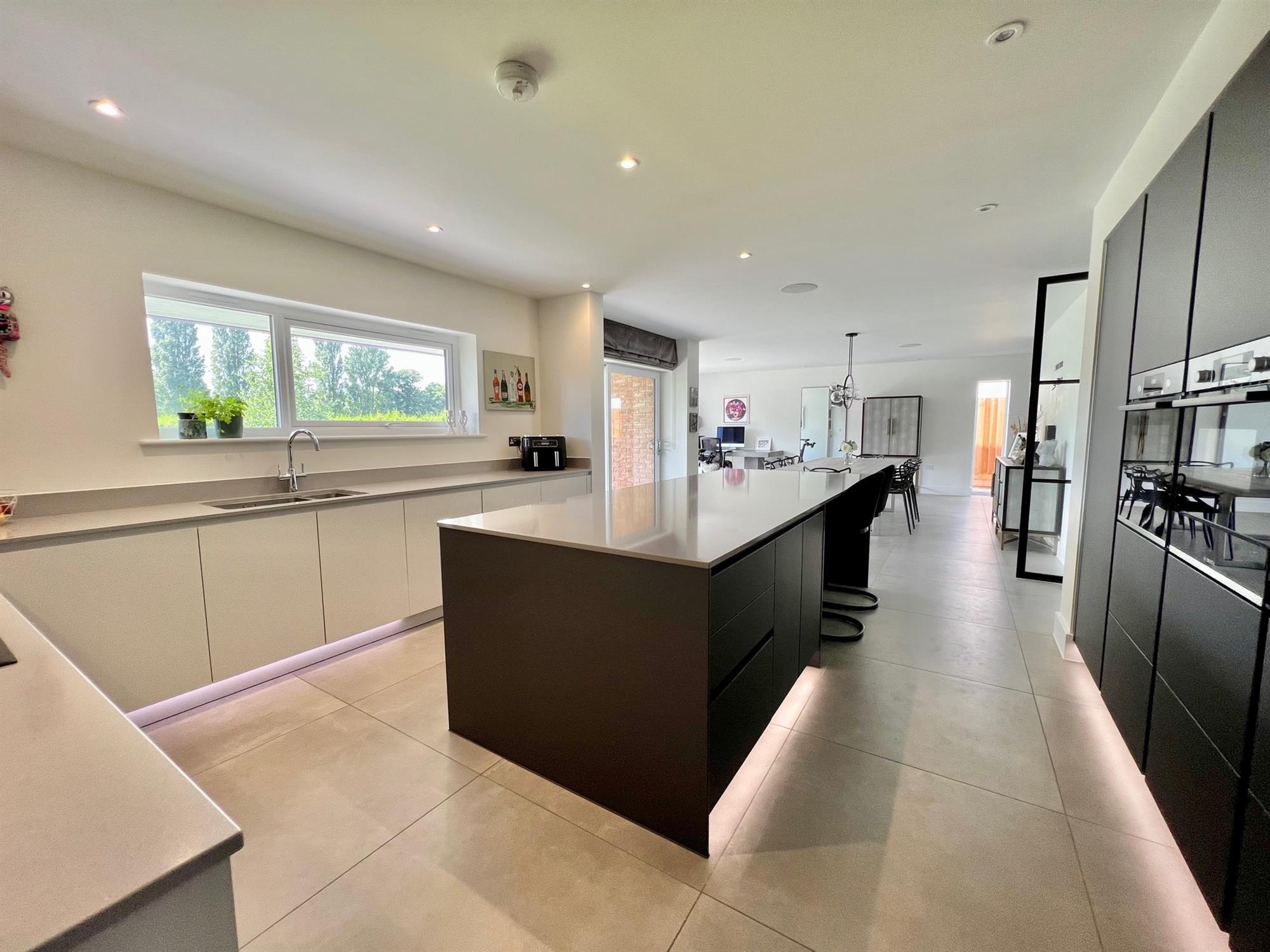 KITCHEN/DINING ROOM - Sliding double glazed double doors leading out onto the rear garden. Double glazed window to the rear. A quality kitchen with stone worktop surfaces with matching splashbacks. Inset 1½ bowl stainless steel sink with mixer tap and grooved drainer. Handleless soft close cupboards and drawers under. Integrated dishwasher, bin unit, inset Bosch induction 5 ring hob. Matching wall mounted cupboards. Stainless steel cooker and extractor hood with underlighting. Wall comprising of fitted storage. Larder fridge and larder freezer. Two built-in Bosch ovens. Built-in combination microwave oven. Central island unit with matching worktops and cupboards under with space for breakfast bar stools. Downlighters. Tiled floor with underfloor heating. Sliding door to:-