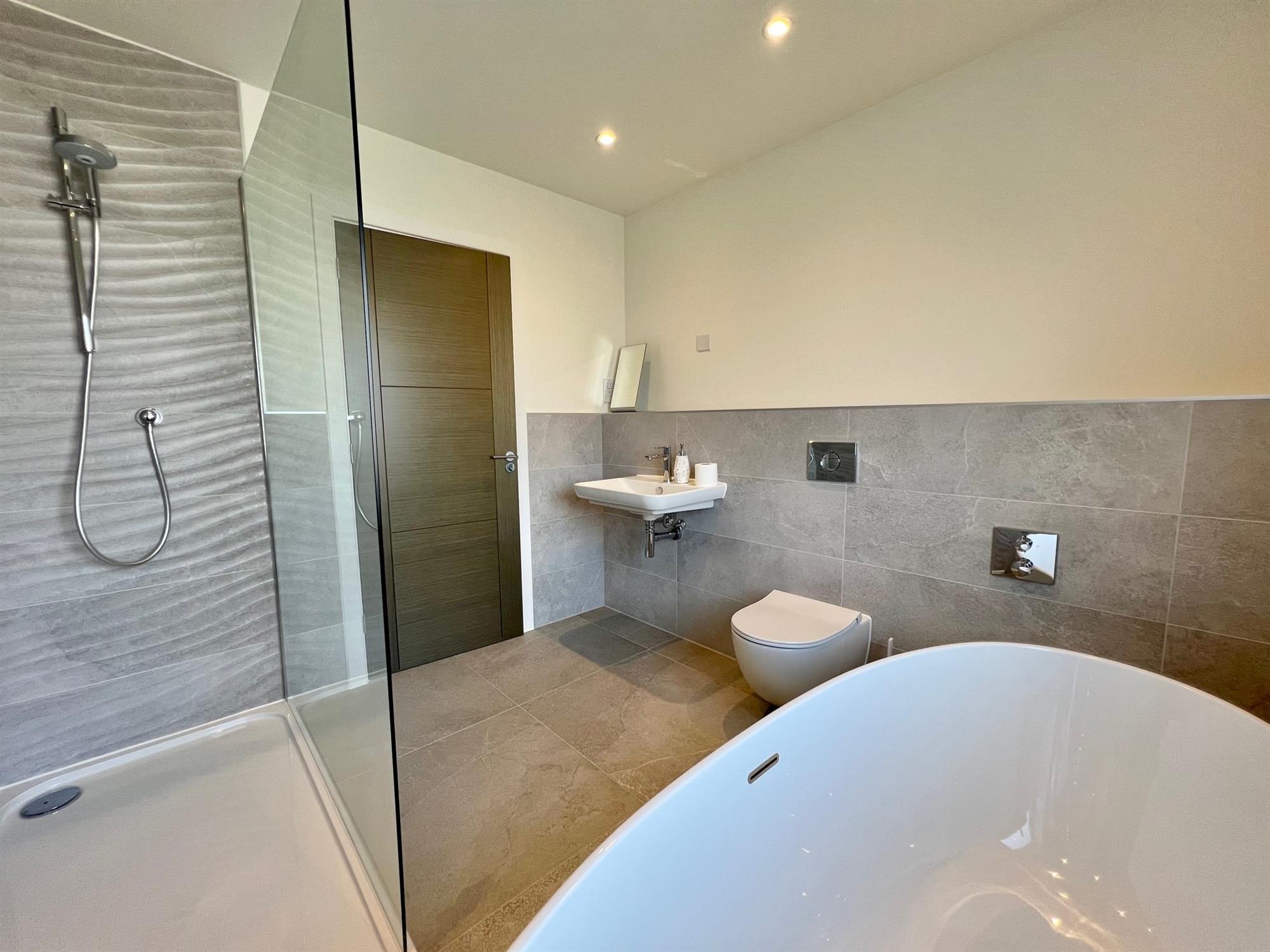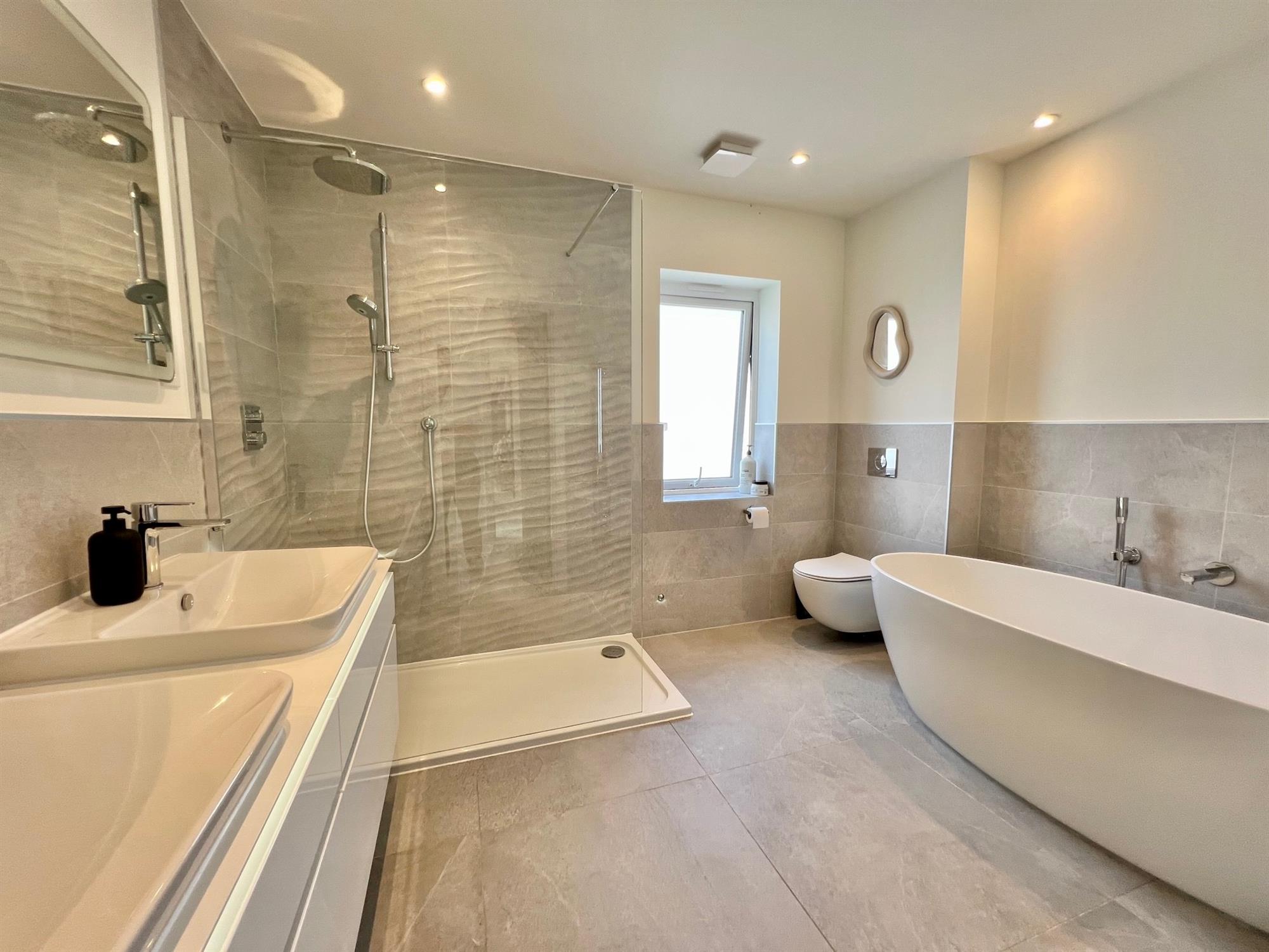 EN-SUITE BATHROOM 10' 5" (3.17m) x 8' 9" (2.67m)Twin wash hand basins with mixer taps in tiled splashback with storage under. Large walk-in shower with twin headed unit. Freestanding bath with mixer tap and shower attachment. Low level W.C. Opaque double glazed window to the side. Downlighters. Extractor fan. Tiled floor. Chrome runged radiator.