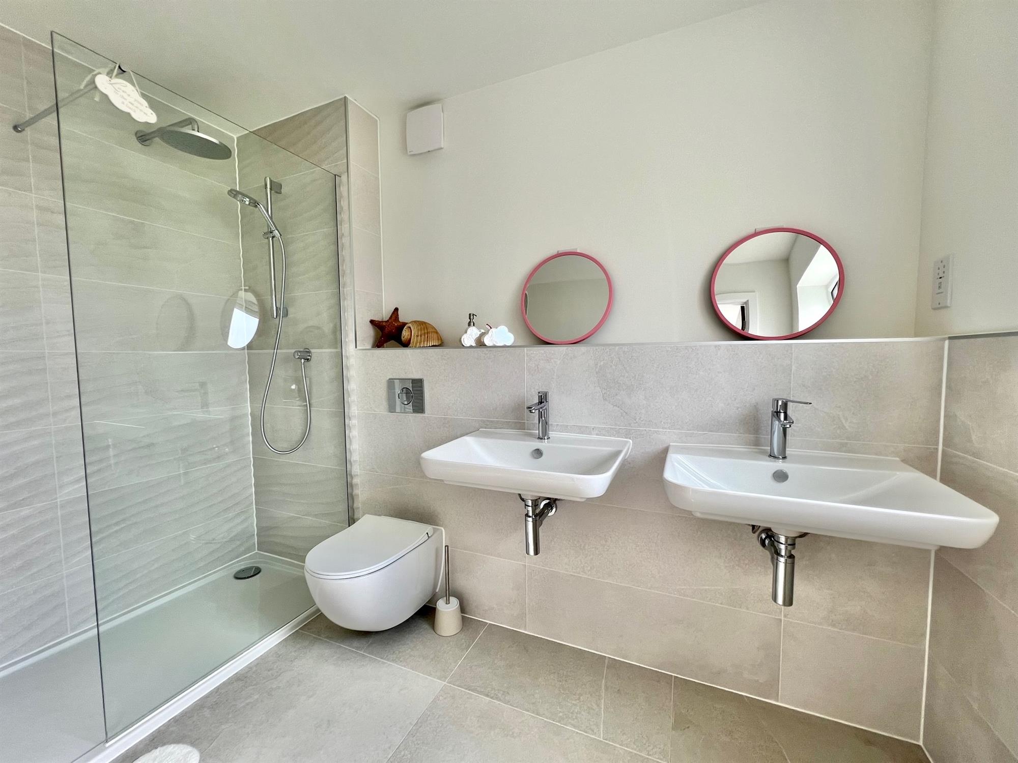 EN-SUITE SHOWER ROOM 9' 7" (2.92m) x 6' (1.83m)Opaque double glazed window to the rear. Twin wash hand basins with mixer taps. Low level W.C. Large walk-in shower with rain head and hand held shower. Tiled floor. Chrome runged radiator. Extractor fan. Downlighters.
