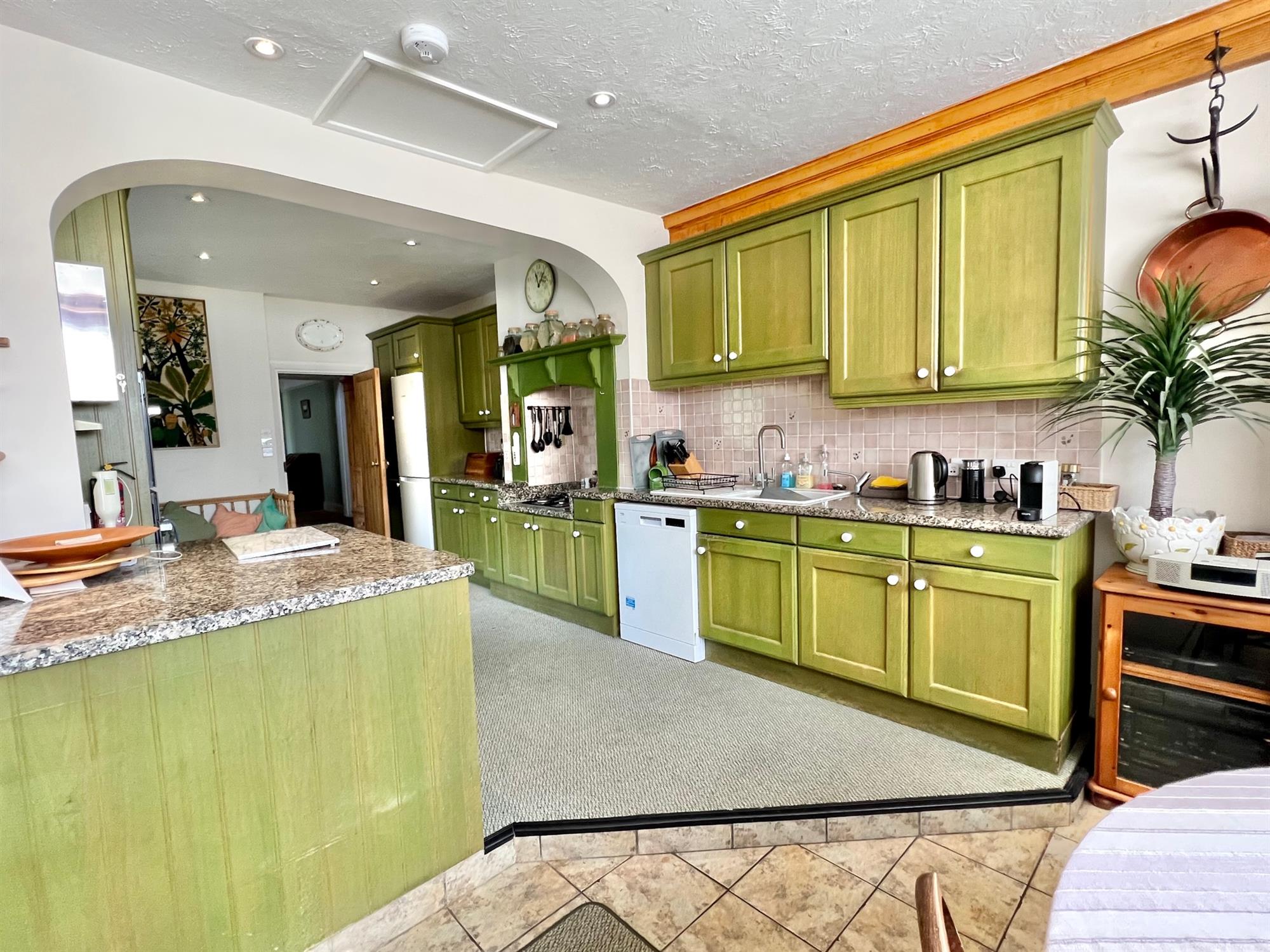 KITCHEN AREA - Granite worktop surfaces in tiled splashback with white ceramic 1½ bowl sink with drainer and mixer tap. Inset four ring gas hob. Cupboards and drawers under with space for fridge freezer and dishwasher. Matching wall mounted cupboards. Downlighters. Granite worktop surface with cupboards and drawer under. Space for fridge, built-in oven and combination oven. Further granite worktop surface with Belfast sink with mixer tap. Cupboards and drawers under. Tiled flooring. Two radiators. Fitted shelving. Larder. Shelving. Wall mounted gas fired boiler.