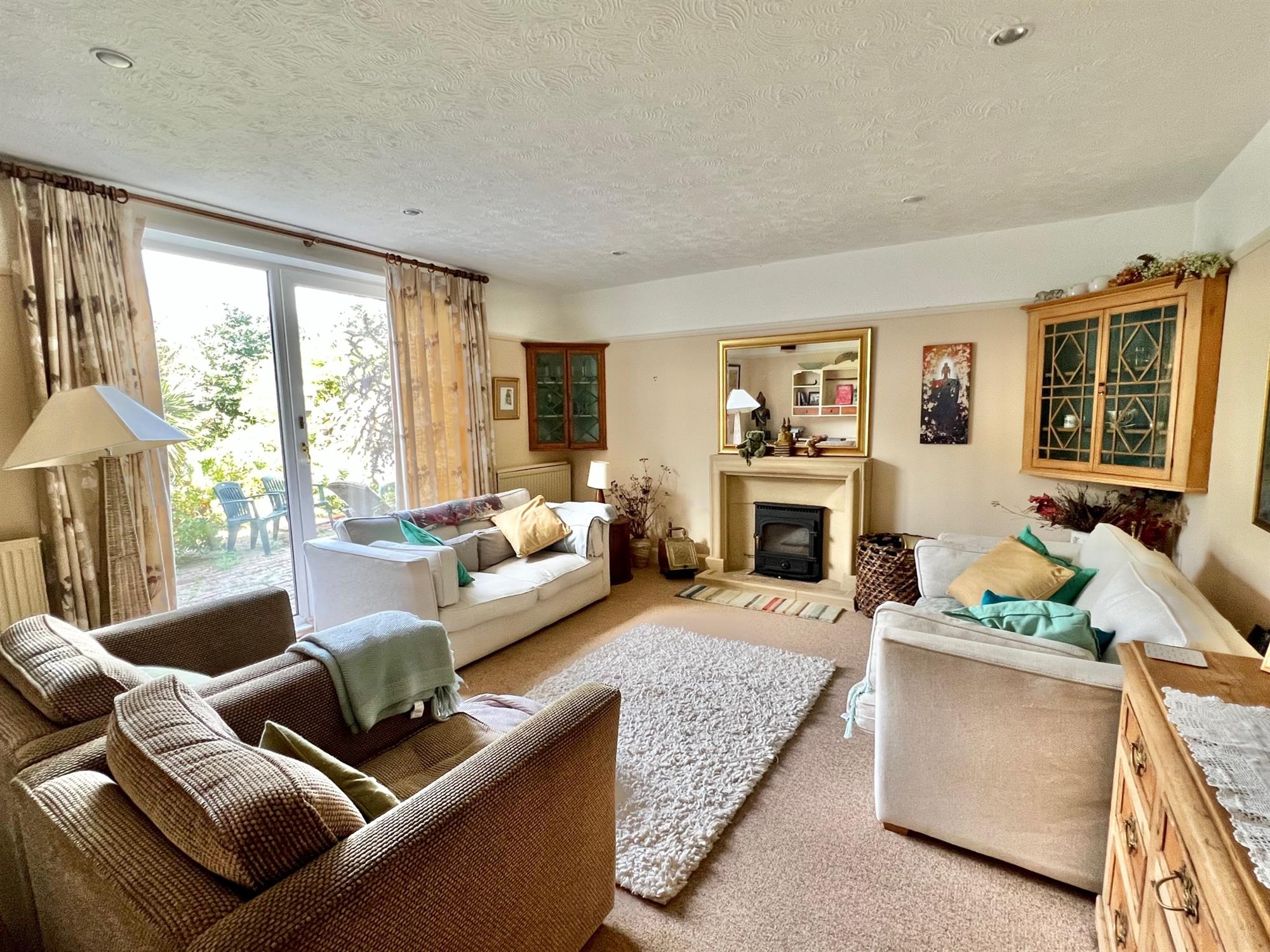Double glazed doors leading out onto the rear garden. Two radiators. Feature Minster stone fireplace with cast iron woodburner. Picture rail. Downlighters.