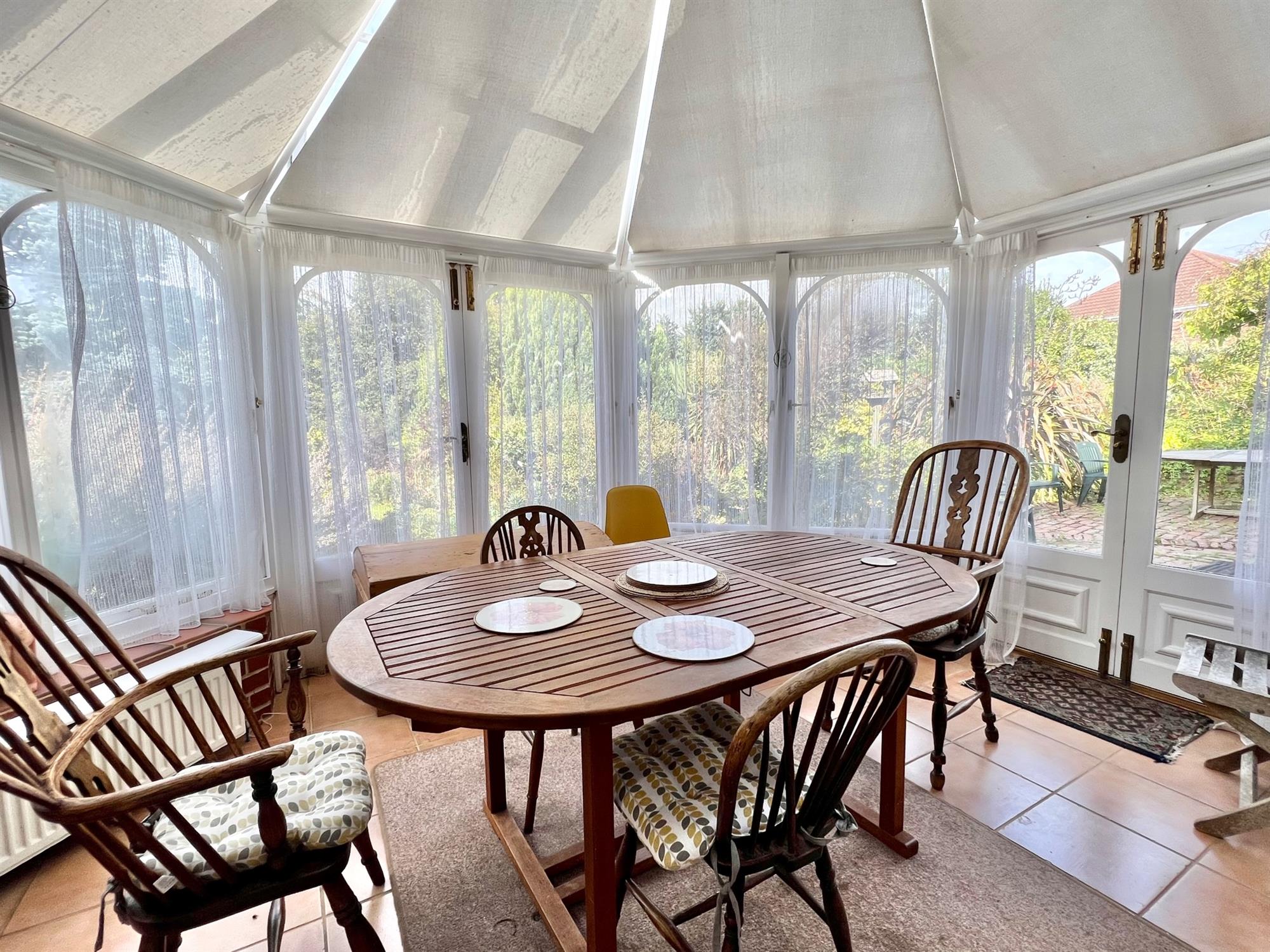 Glazed windows to three sides. Glazed double doors leading to the rear and side. Double glazed roof. Tiled floor. Two radiators. Feature port hole stained glass window.