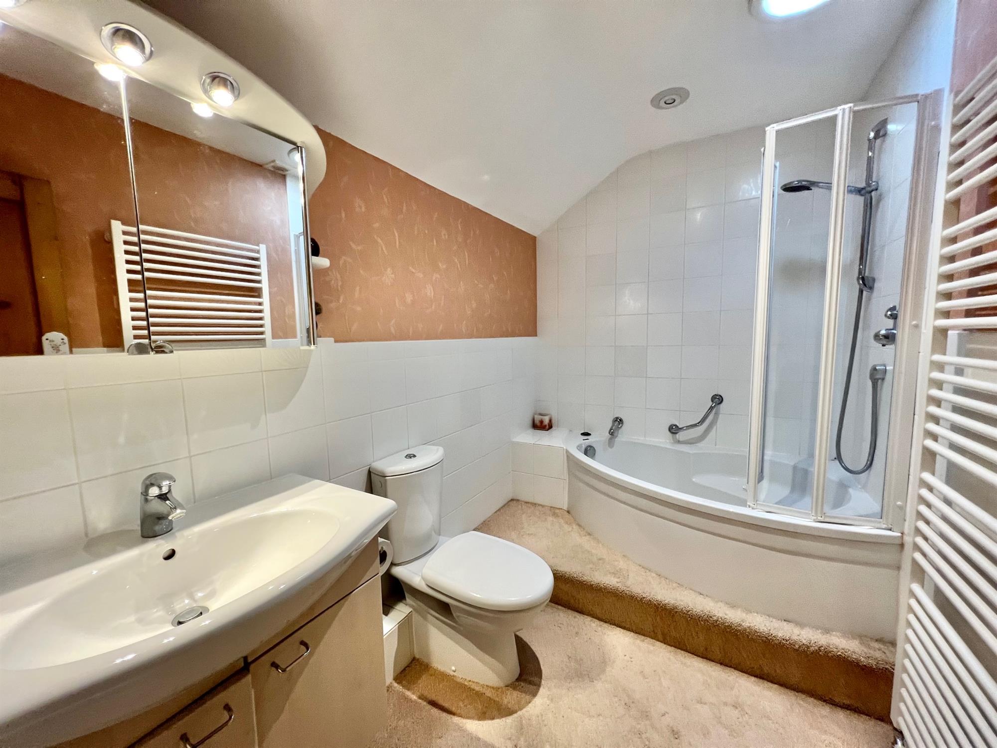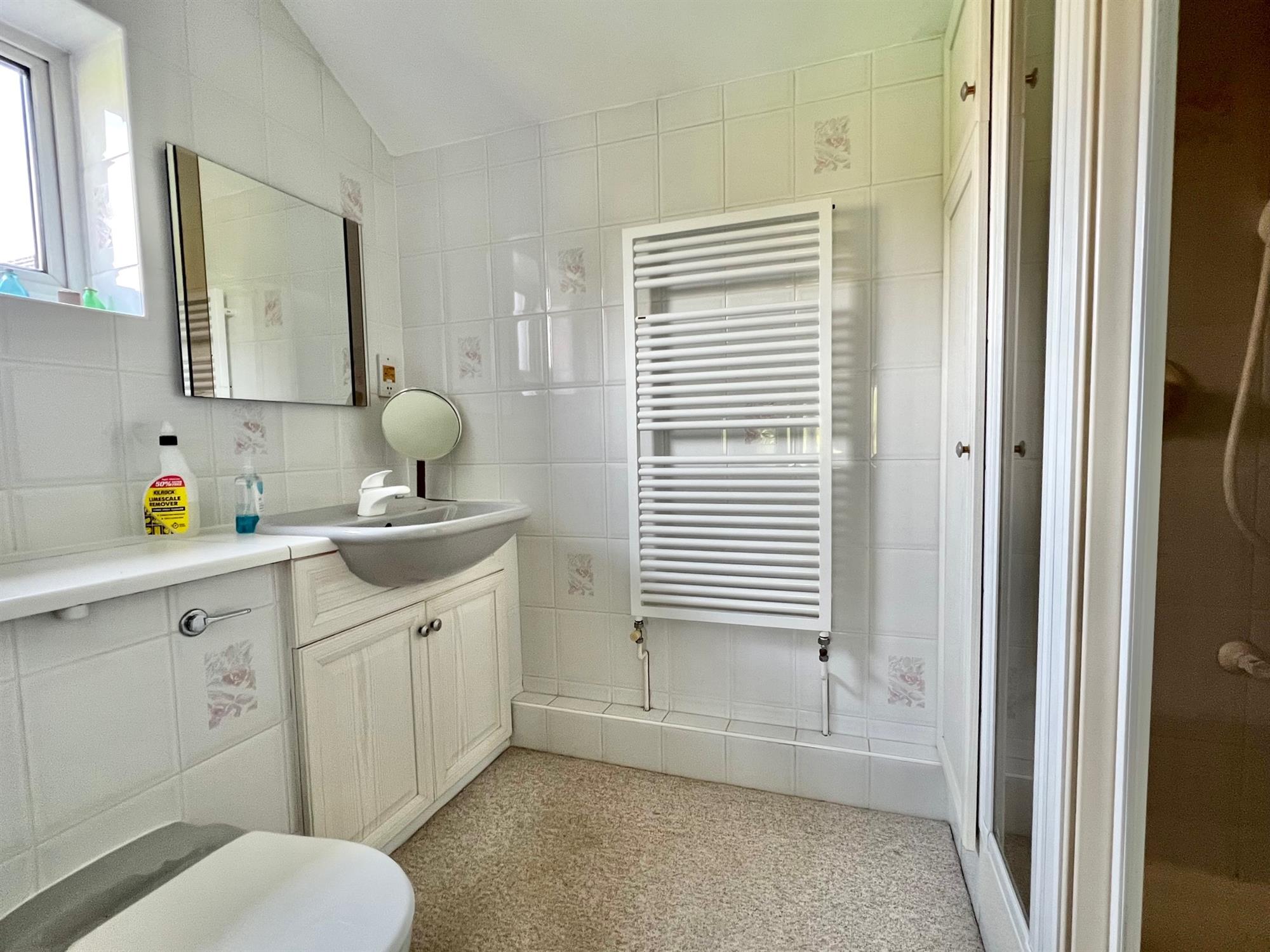 Large corner shower cubicle in full tiled surround with built-in Grohe shower. Fitted wash hand basin with mixer tap and cupboards under. Low level W.C. Walls in full tiled surround. Downlighters. Sun tube extractor fan. White runged radiator.