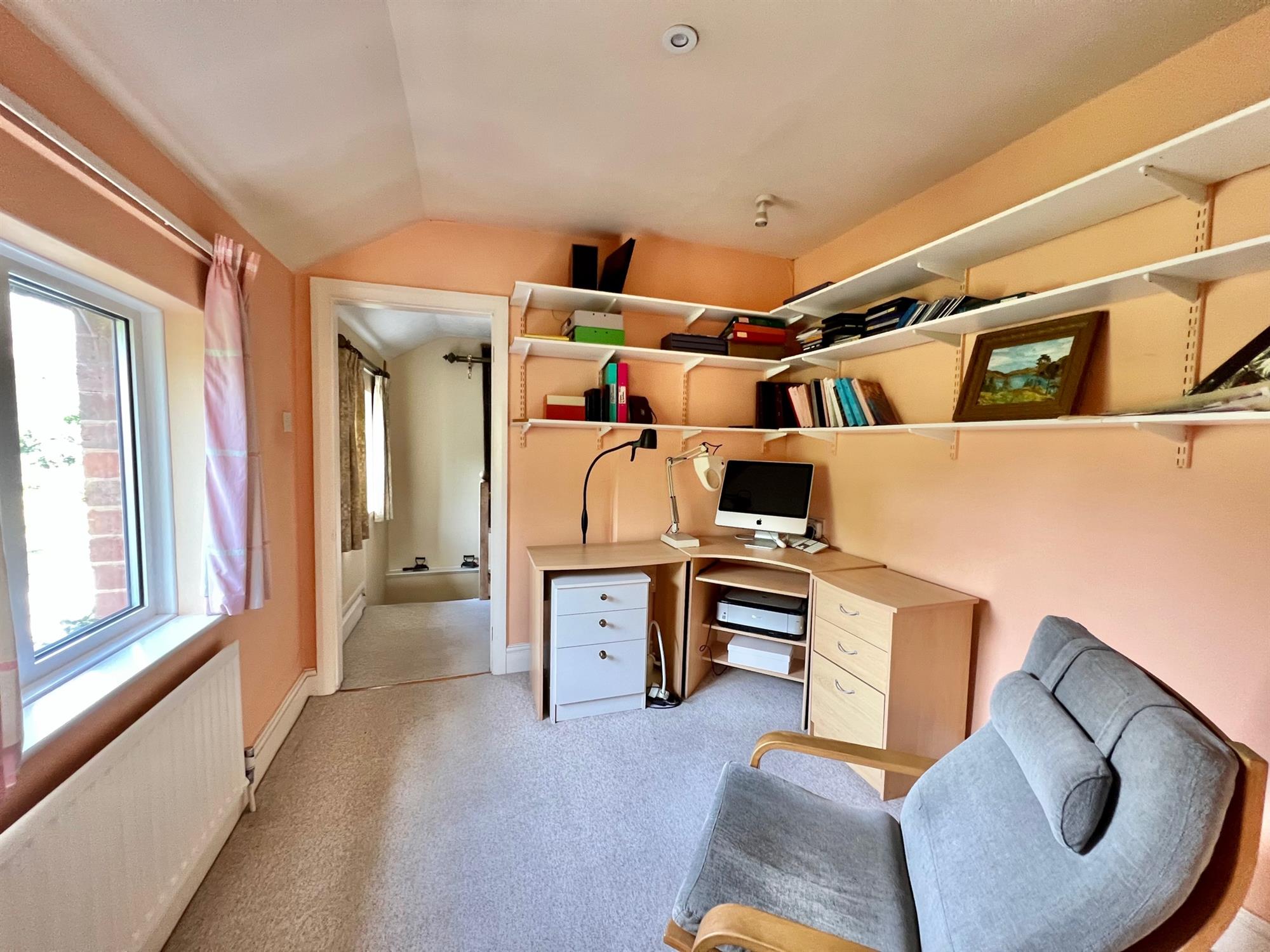 Two double glazed windows to the rear. Two double glazed windows to the side. Range of fitted book shelving. Downlighters. Radiator. Door to:-