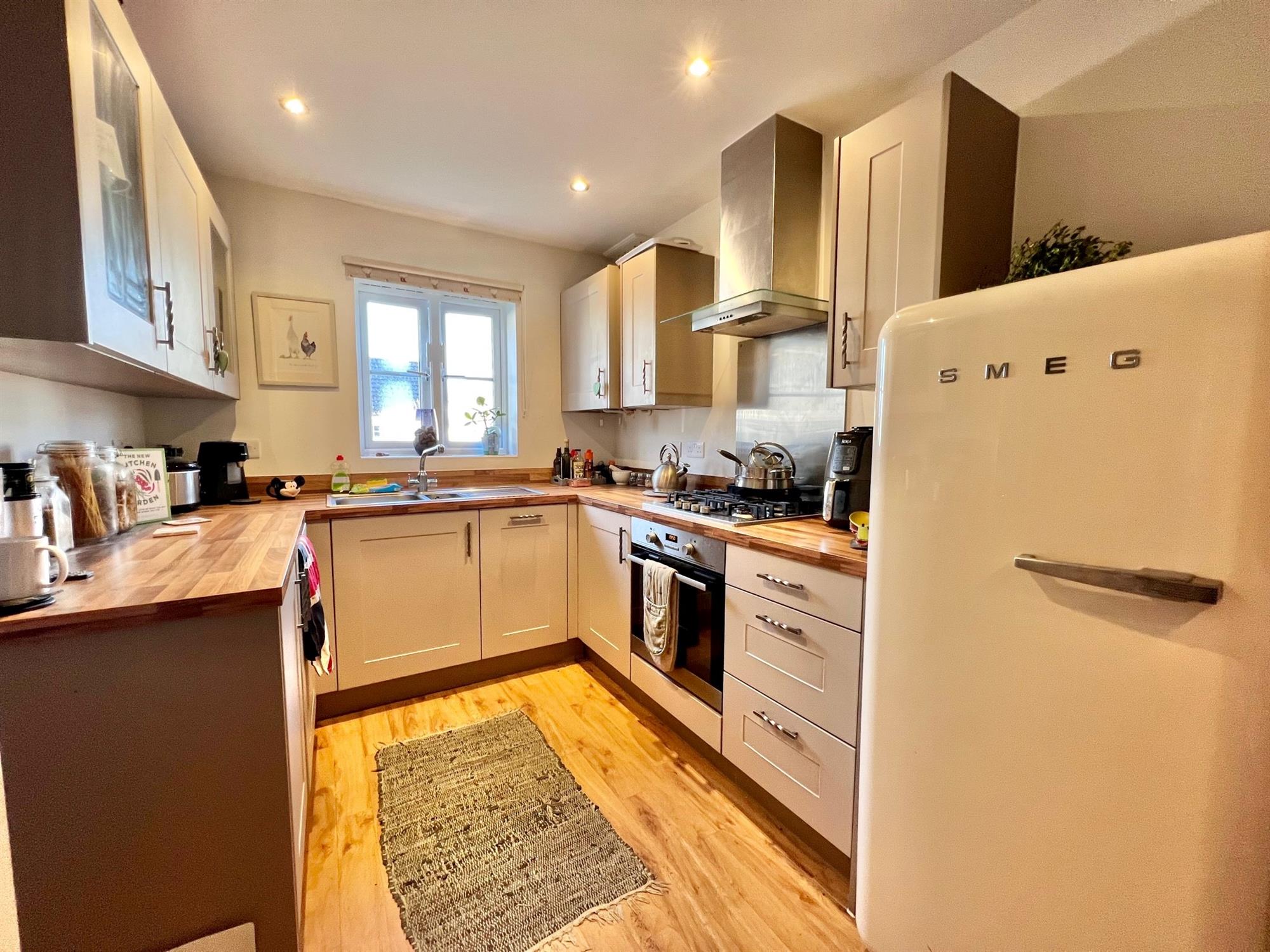 Kitchen area has wood effect worktop surfaces with matching upstands. Inset 1 ½ bowl sink with drainer and mixer tap. Integrated washing machine and dishwasher. Integrated stainless steel fronted oven, integrated stainless steel 4 ring gas hob. Matching wall mounted cupboards with two glass fronted display cabinets. Stainless steel splashback, stainless steel and glass cooker hood with under lighting. Space for fridge freezer. Karndean flooring in wood effect. Double glazed window to the front. Radiator.